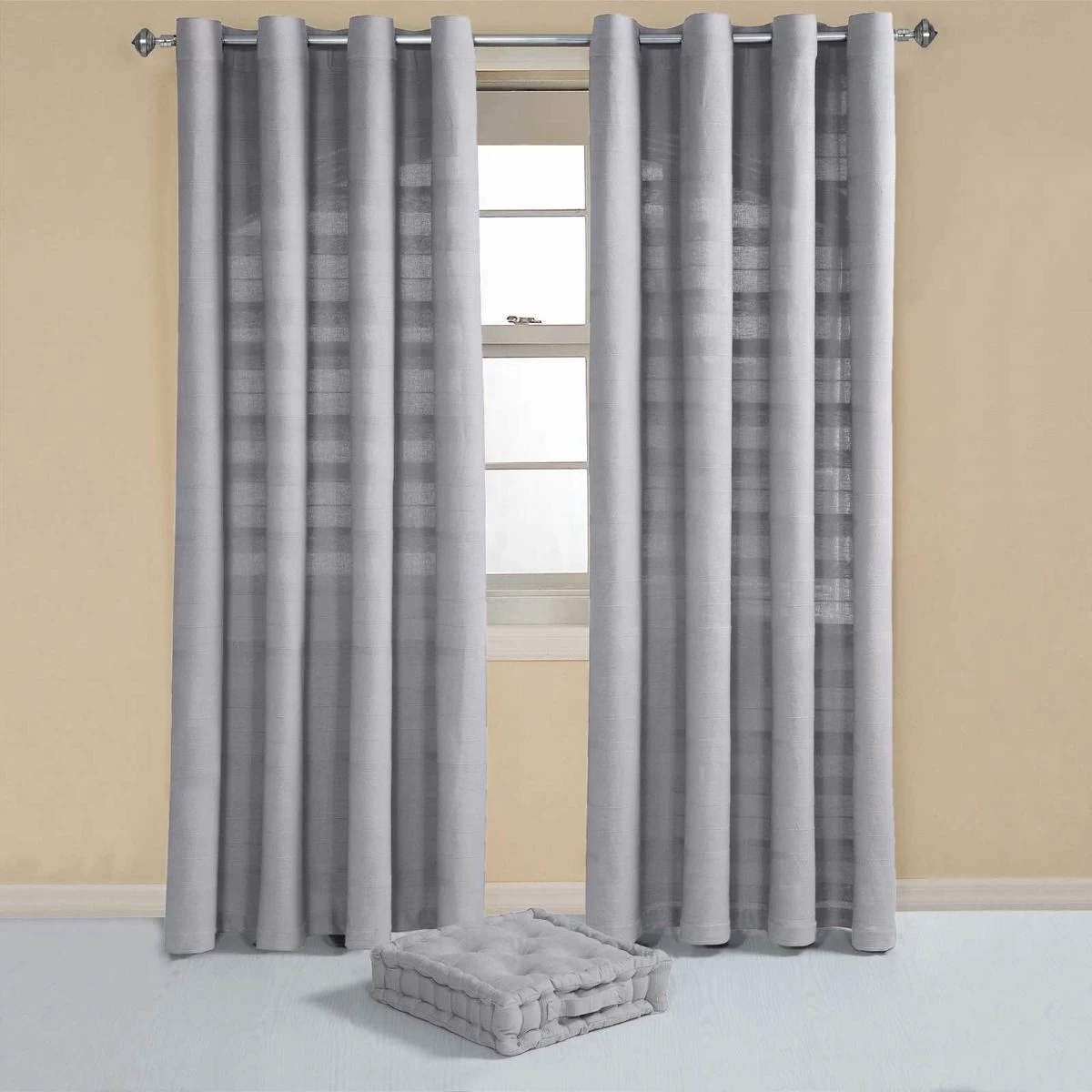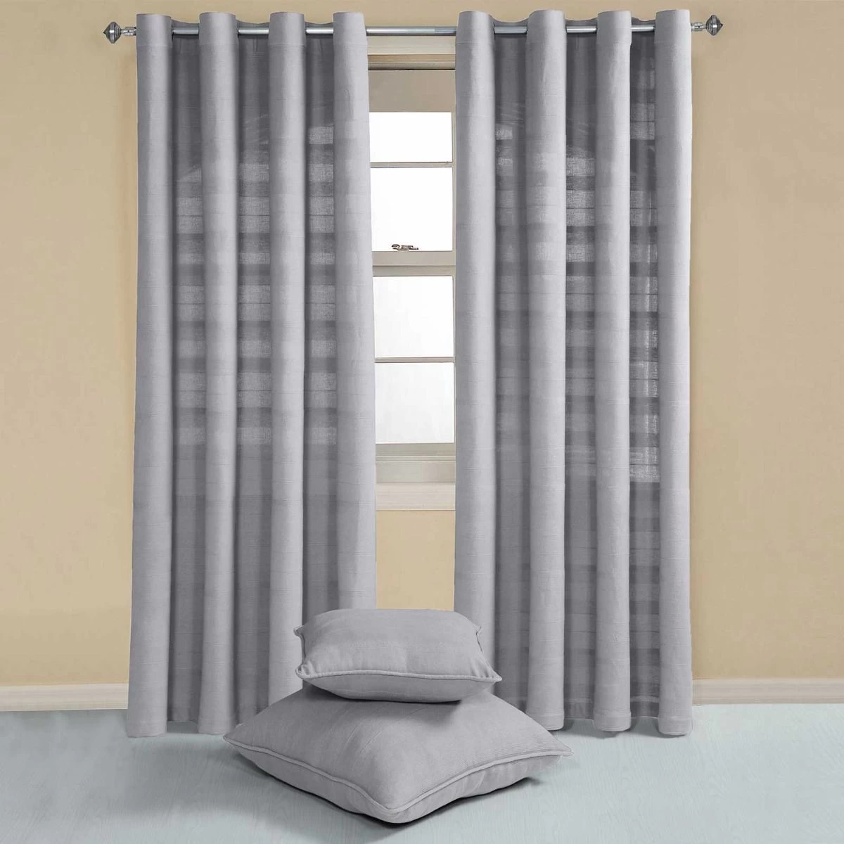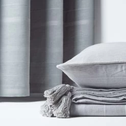 On trend silver grey eyelet curtains, hand woven from 100% cotton with a delicate ribbed effect, perfect to pair with our Rajput cushions.