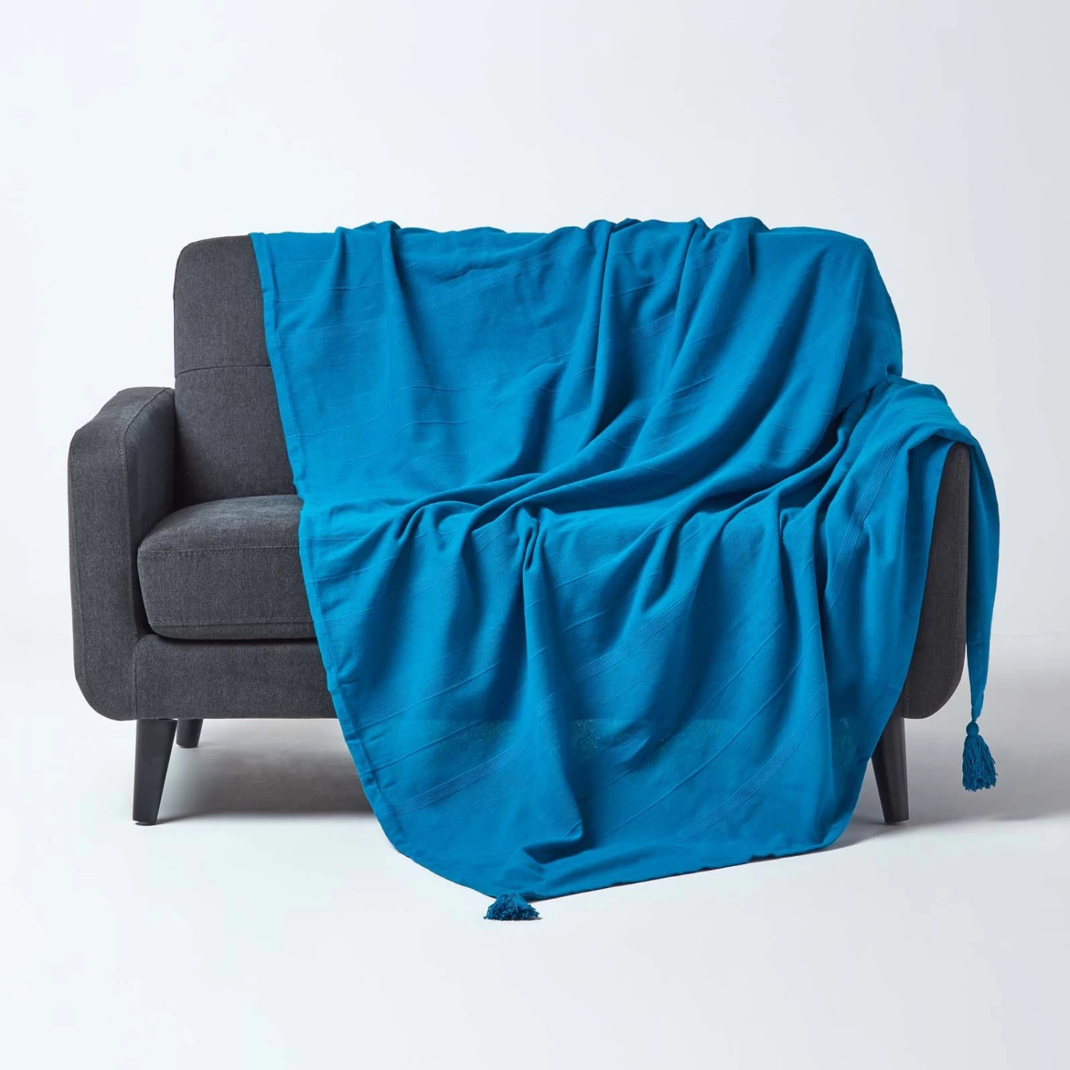 100% Cotton Rajput Ribbed Teal Throw from Homescapes range of soft furnishings is designed to provide a quick and extremely affordable makeover of any room. Manufactured on traditional handlooms the colours of Rajput Ribbed Throw range have been chosen very carefully which include the current hot trends and also the ever green classics. This range includes throws in three sizes, 60 x 80 Inches, 90 x 100 Inches and 100 x 140 Inches, coordinating curtains in 54 Inch and 90 Inch drop and prefilled cushions. Homescapes offers this range in solid colours and in stripes made of graduation of colours.