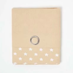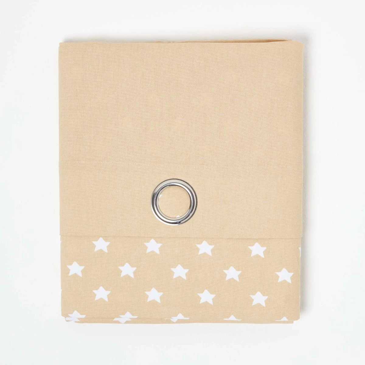 These creamy Beige Stars Eyelet Curtains will add a subtle touch of magic to any room, while also adding soft elegance with the patchwork panels at the top and bottom of these curtains. These enchanting Beige Stars Curtains are one pair in Homescapes impressive range of pure cotton designer curtains in many charming designs and soft prints. Our modern ring top or eyelet curtains are made with heavy cotton fabric and a wide range of colours, which allows our curtains to coordinate well with almost any interior setting and the vivid colours used are able to uplift the mood of any room. These curtains are suitable for all spaces, and would fit perfectly in the kids rooms due to their refreshing print. Please note, these curtains are not lined and so they will have to be used in conjunction with a black out curtains in order to make them light proof. Coordinating fabric (to make your own soft furnishings), cushions and floor cushions are also available with Homescapes.