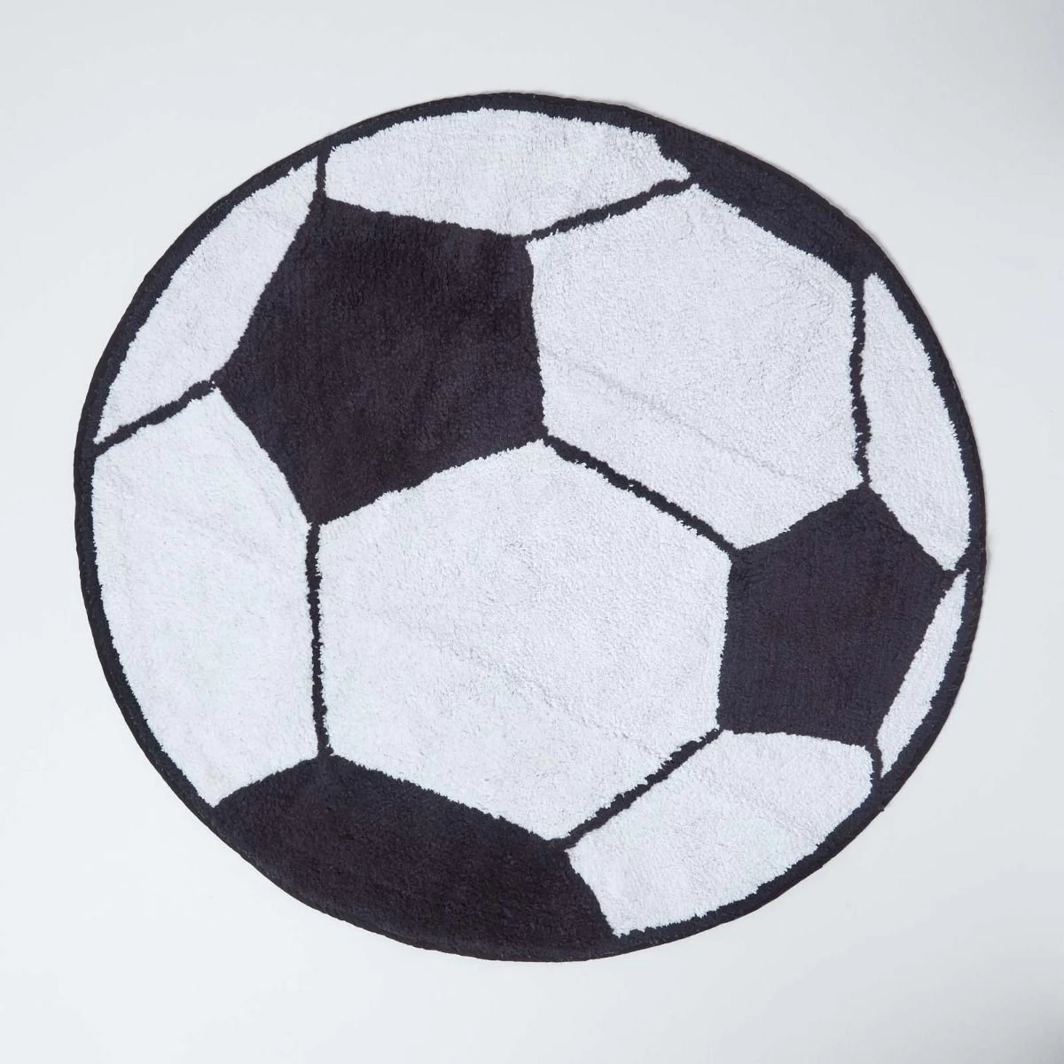 Black & White round football rug, ideal for children’s bedrooms, playrooms and bathrooms. Hand tufted from 100% cotton, washable at home.