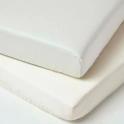 Set of 2 cream 100% organic cotton cot bed sheets. Washable, hypoallergenic and perfect for baby soft skin, this two-pack of toddler bed sheets are durable and super soft.
