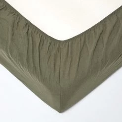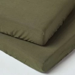 Khaki green deep fitted cot bed sheet from Homescapes’ children’s bed linen range. With a fully elasticated skirt, this child’s cot bed sheet is woven from a premium blend of cotton and linen.