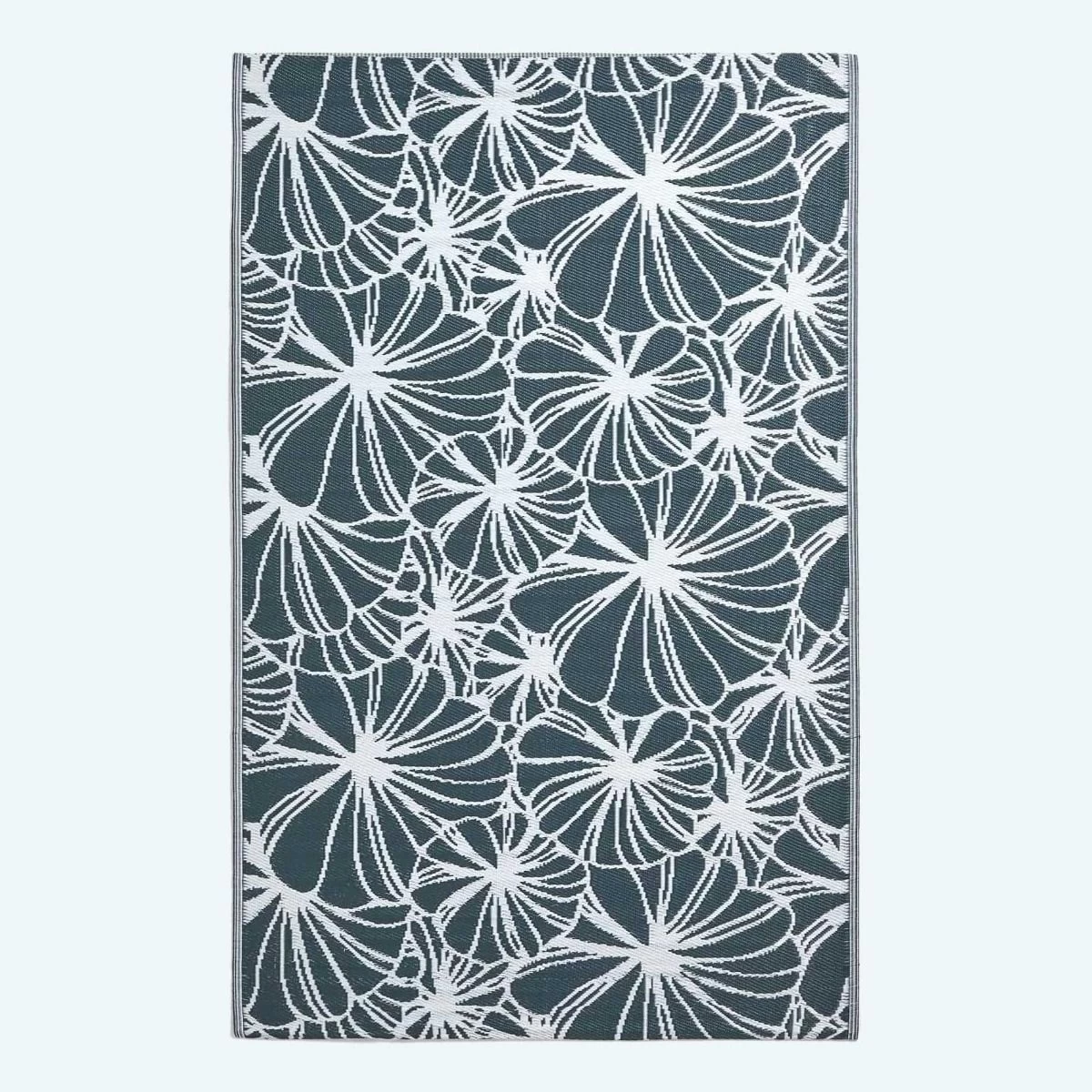 Lilypad style outdoor rug in green and white. Woven from 100% recycled plastic, this reversible garden rug can be used on grass, concrete, decking and more.