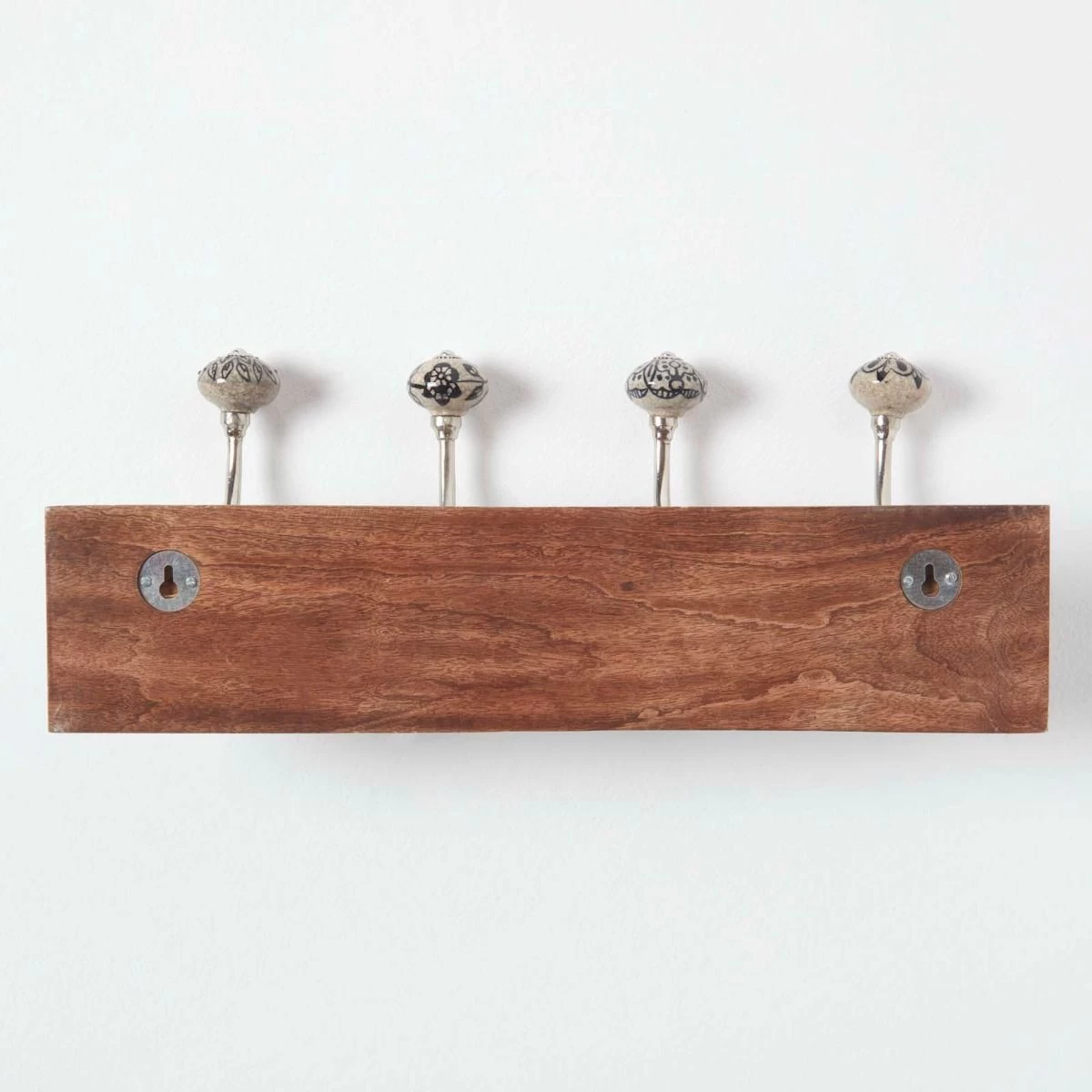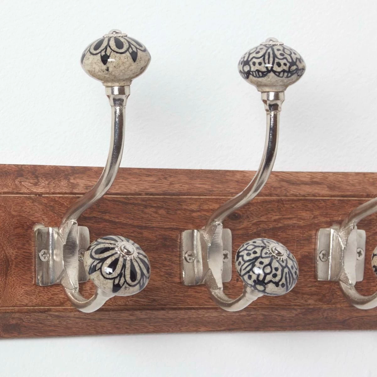 Wall mounted coat hooks on a solid wood back, these decorative coat hooks are adorned with intricate ivory and black knobs that feature a natural urban design. A functional and decorative addition to your entrance hall or utility room, these wall mounted coat hooks feature 4 metal hooks and are great for storing away coats and jackets..