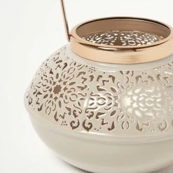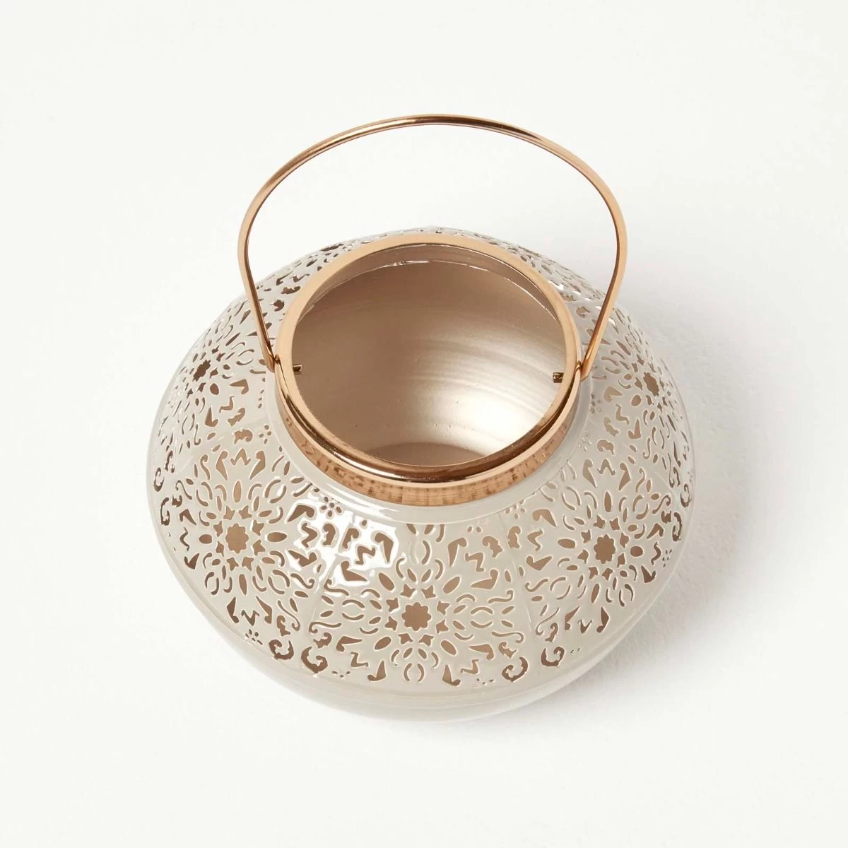 Traditional style metal lantern, round grey indoor lantern with handle for small candles or tea lights. A colourful addition to your bedroom or living space.