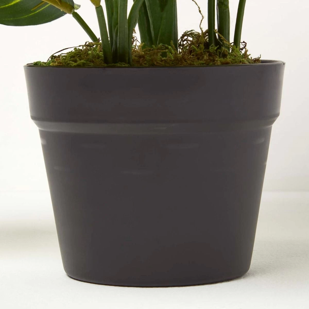UV protected for lasting colour, indoor artificial plants can be styled around the room, brightening up a living room corner or adding a natural touch to bedrooms and bathrooms. To care for your fake plant simply dust it regularly with a dry cloth. A versatile plant that can be styled however you wish, each leaf can be manipulated into your desired look and shape. Potted in a simple black pot, we recommend placing into a decorative pot or planter to suit your décor style.