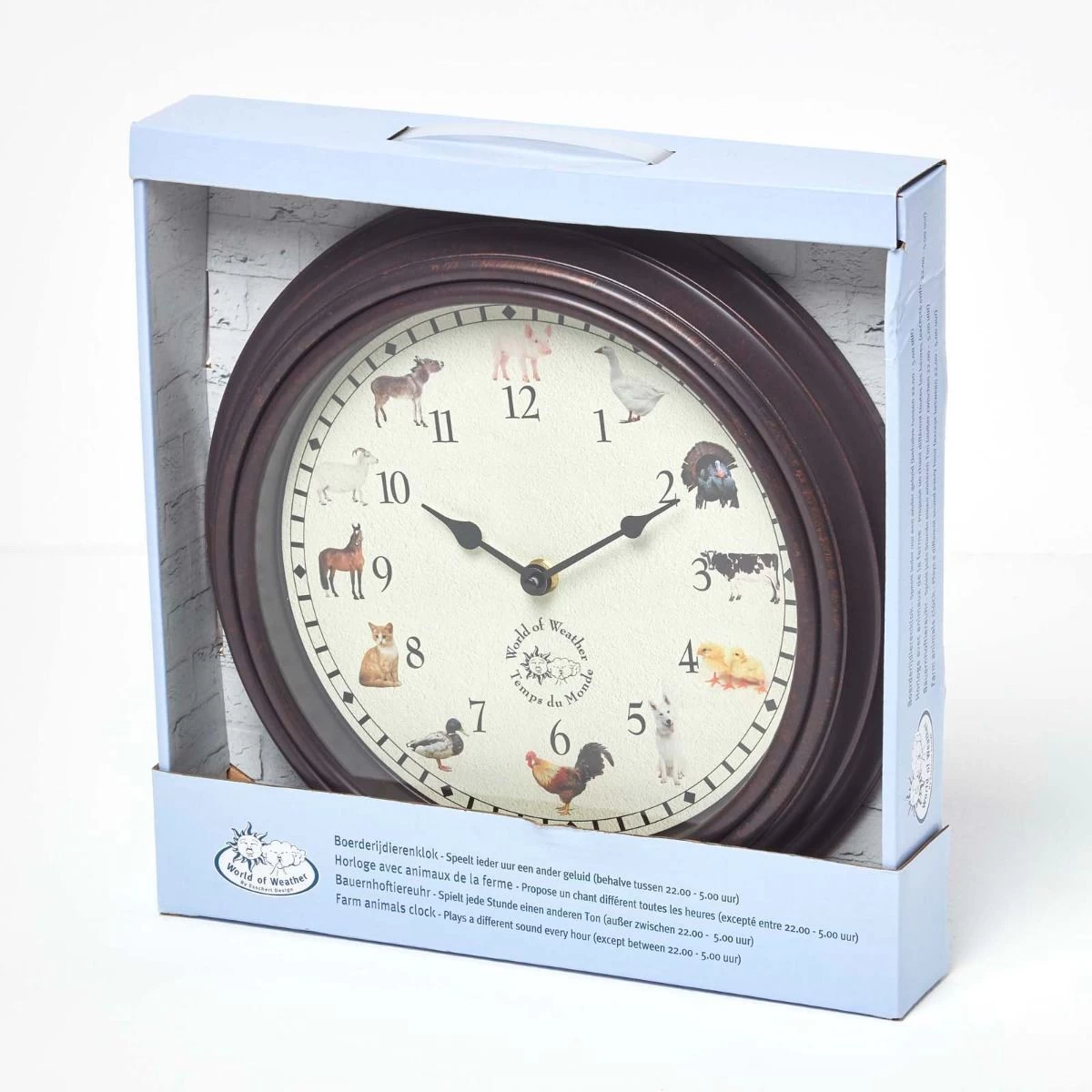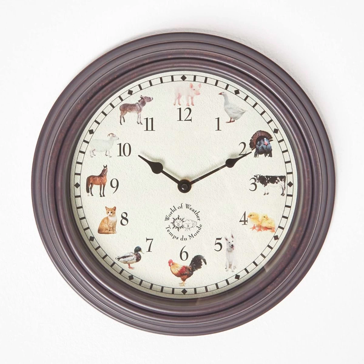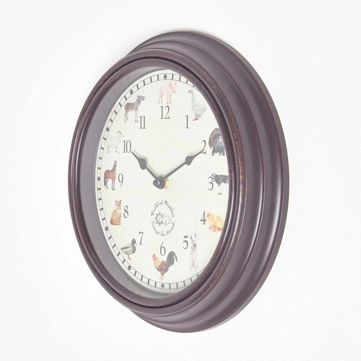 An on-trend cottagecore inspired farm wall clock, illustrated with farm animals. Colourful animal wall clock makes a different sound for each hour.