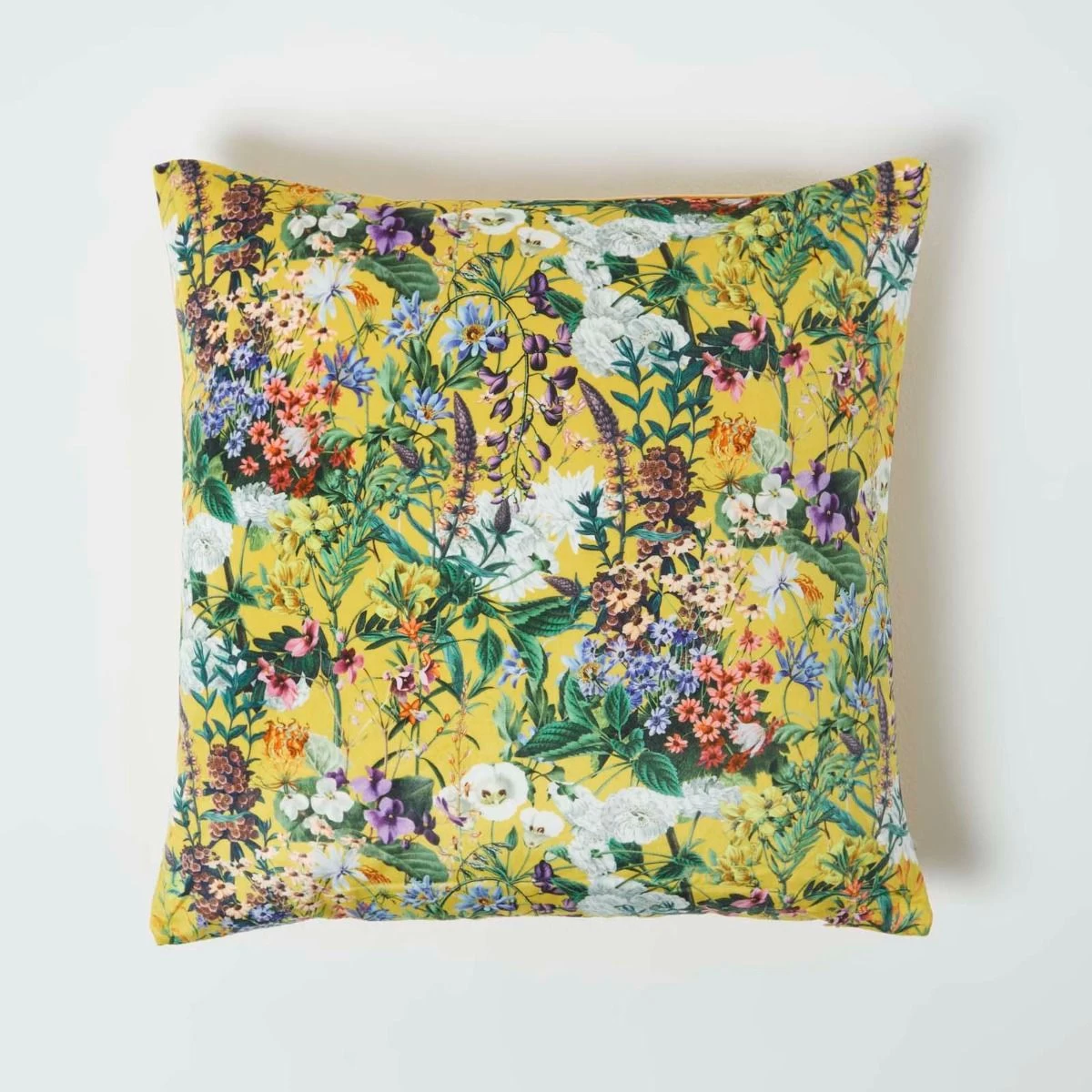 Yellow Botanical Cushion by Homescapes. Bring the beauty of the outdoors into your home with this luxury floral velvet cushion, woven with a wild garden print.