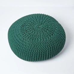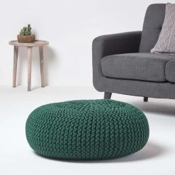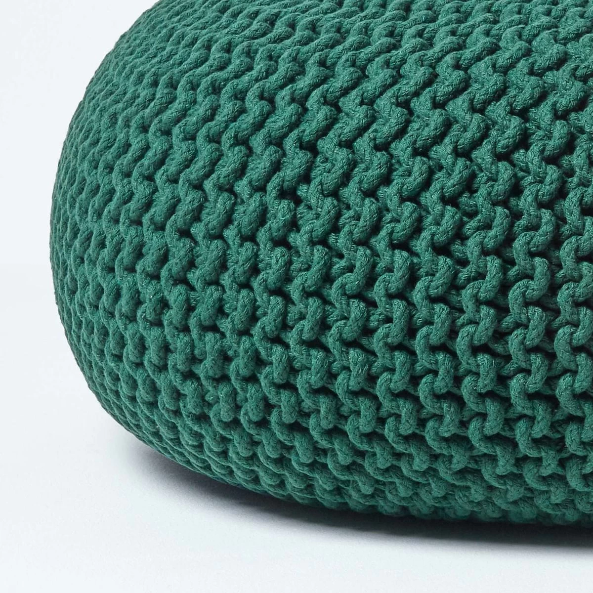 Large circular knitted pouffe handwoven from deep forest green chunky knit cotton and prefilled with polystyrene beads. A large round pouffe which can be used as a footstool, occasional seat or even a coffee table, it measures 70cm wide and will introduce a contemporary style into your living space. Handcrafted by skilled artisans, this durable home accessory is tightly stuffed, providing a firm and supportive seat or resting surface.