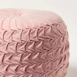 Dusky pink pouffe with super soft velvet pleated cover, this pink velvet footstool is generously filled for lasting comfort. 50 cm wide decorative footstool for living room or bedroom vanity.