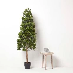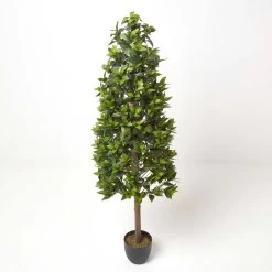 Faux Bay Tree from Homescapes, styled in a decorative pyramid shape and measuring approximately 5 ft tall. Handcrafted from experts, stem constructed from wood.