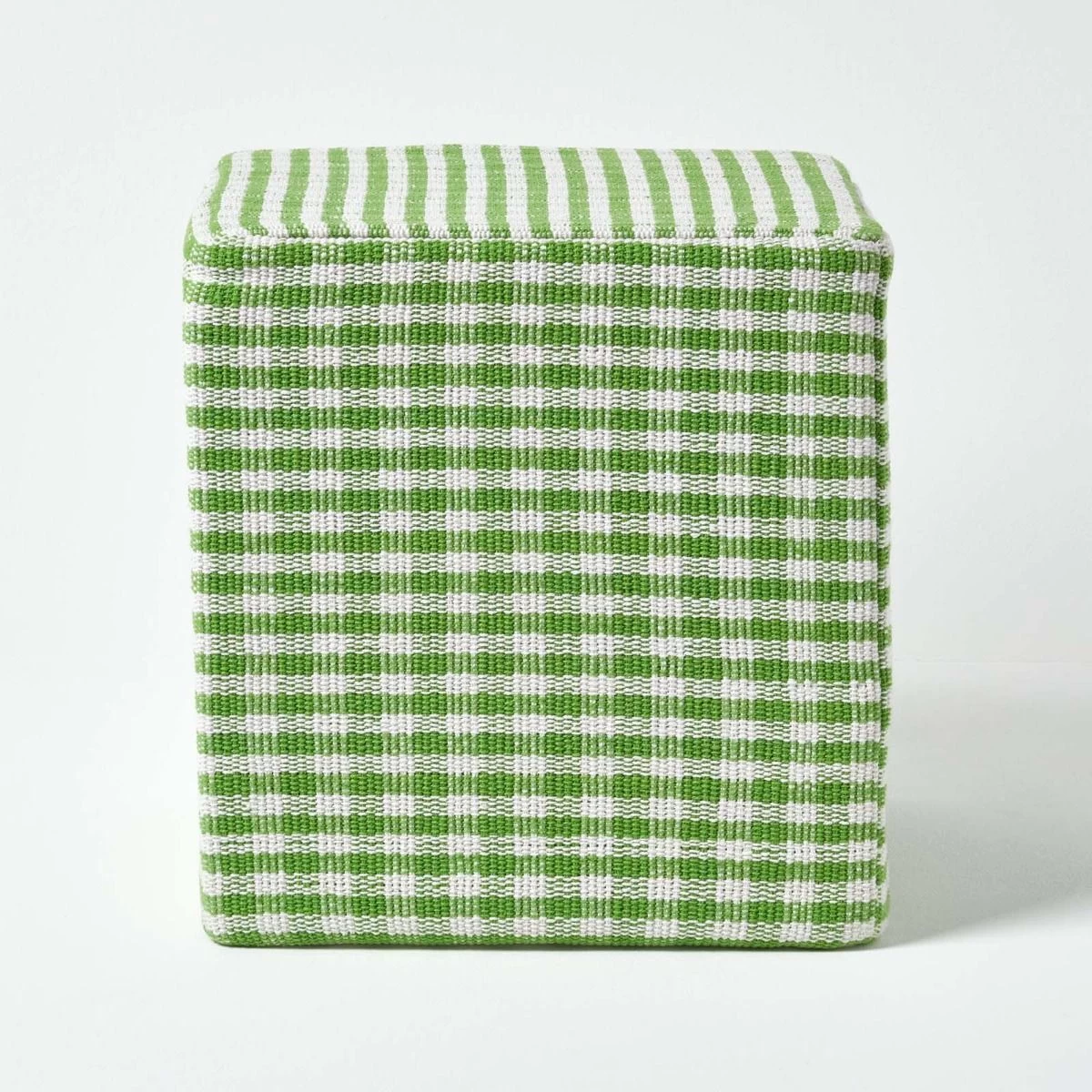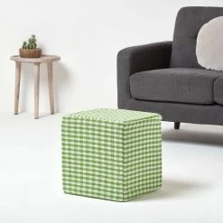 Homescapes lite cube pouffe covered in cotton with a fresh green gingham check, available in three colour combinations and a cylindrical shape.