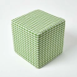 This decorative handmade cube pouffe upholstered in cotton with a classic Green Gingham check can be very decorative in any interior and add a warm and rustic but stylish hint into your home décor. The outside of the pouffe is extremely soft because of its 100% cotton fabric and the inside is filled with a soft but sturdy foam that keeps its shape even after using it for a long time; available in a blue and pink Gingham check as well.