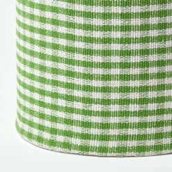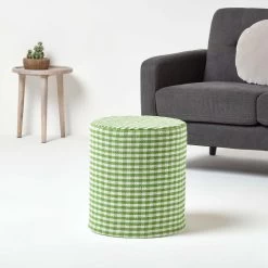Homescapes round pouffe upholstered in soft cotton with bright green and white gingham check and filled with fluffy foam, available in 3 different colours.