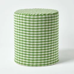 Homescapes round pouffe upholstered in soft cotton with bright green and white gingham check and filled with fluffy foam, available in 3 different colours.