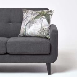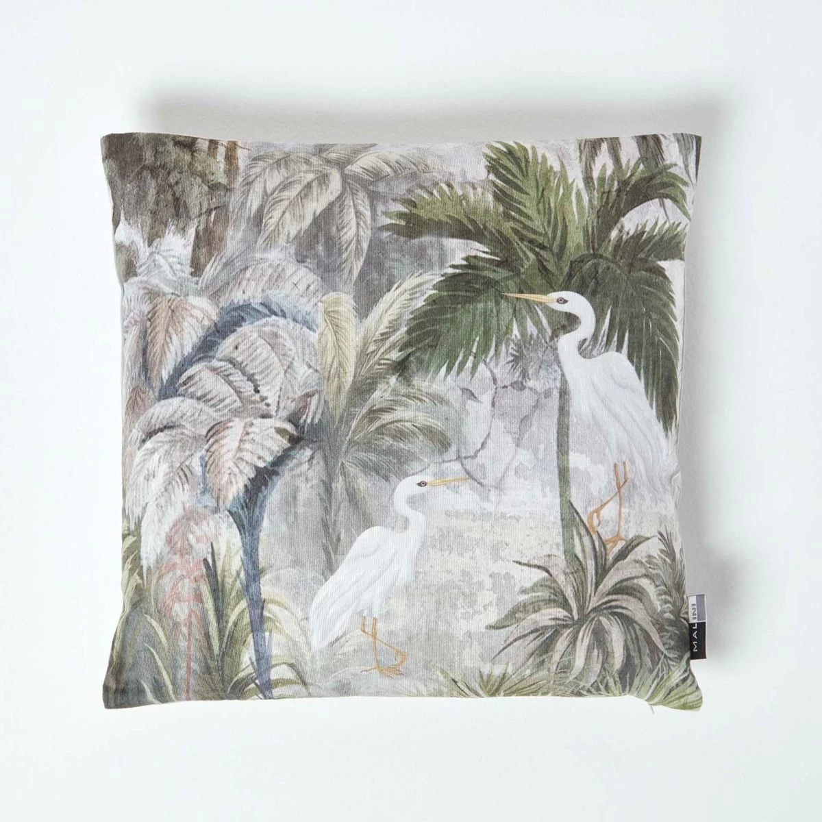 A colourful and striking cushion that will make a statement in any room, this printed crane cushion features 2 lifelike white birds set against a tropical leafy setting. Surrounded by botanical trees and palms, this green and natural cushion will co-ordinate with earthy tones.