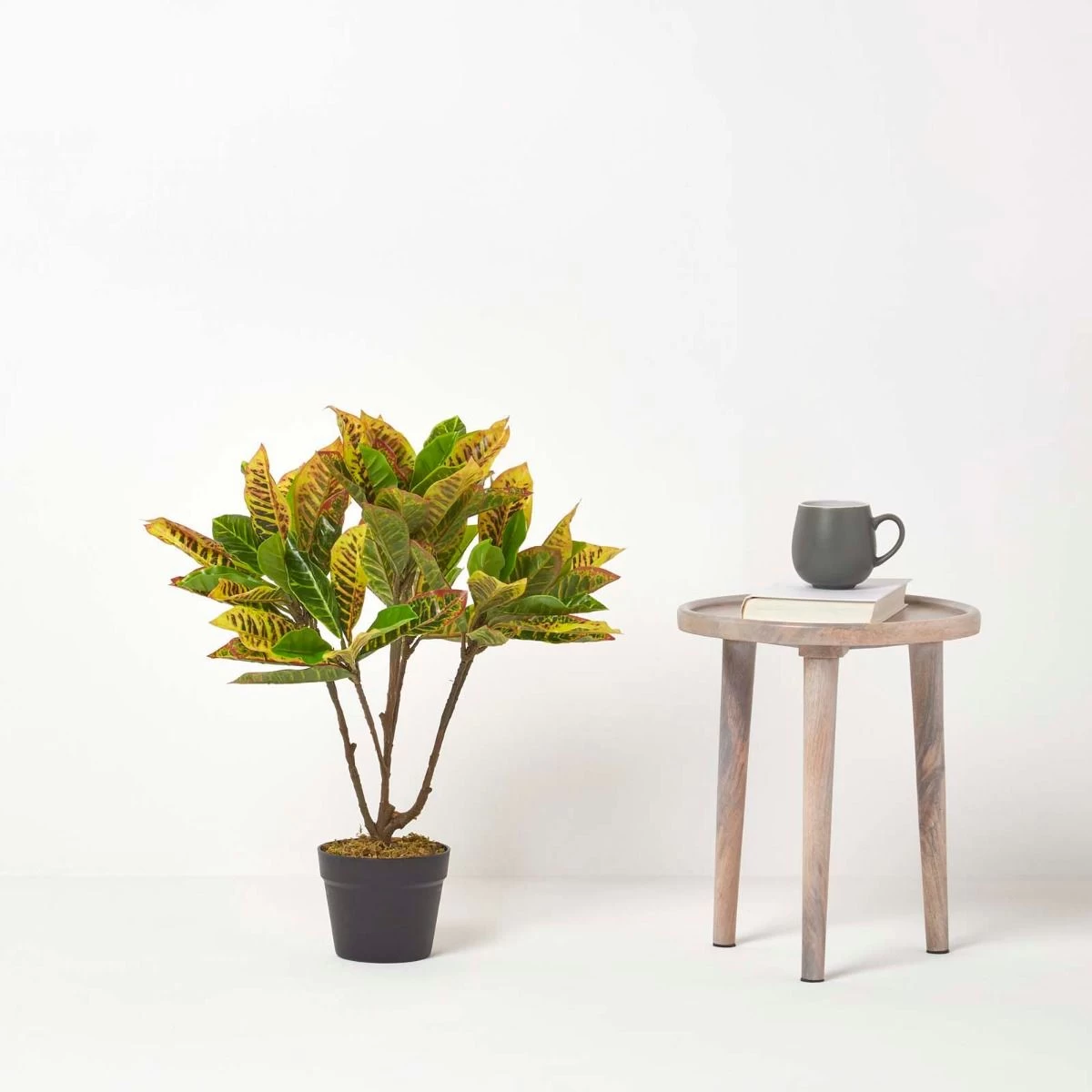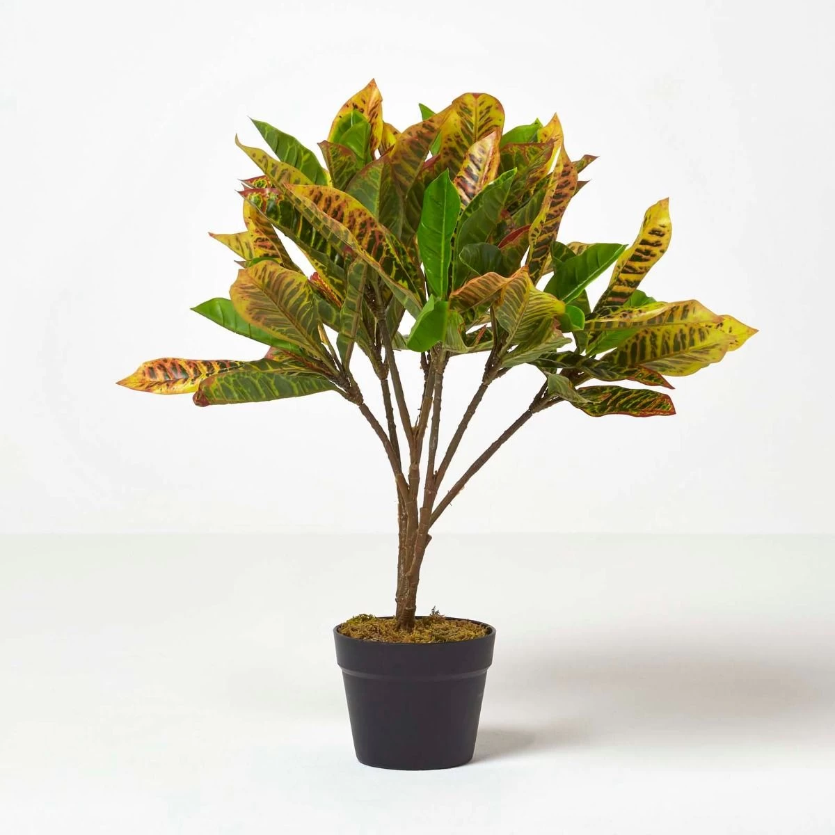 Ideal as a floor plant, a table centrepiece or a sideboard decoration, this colourful artificial croton tree will set a tropical tone in your home. Standing at 65 cm tall, this replica houseplant comes in a black plastic pot and is set with a faux-moss top, giving it a lifelike look while requiring none of the watering or pruning that a living plant would demand. Simply place into a decorative container to achieve sleek, natural style.