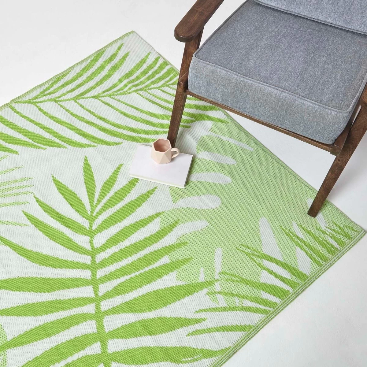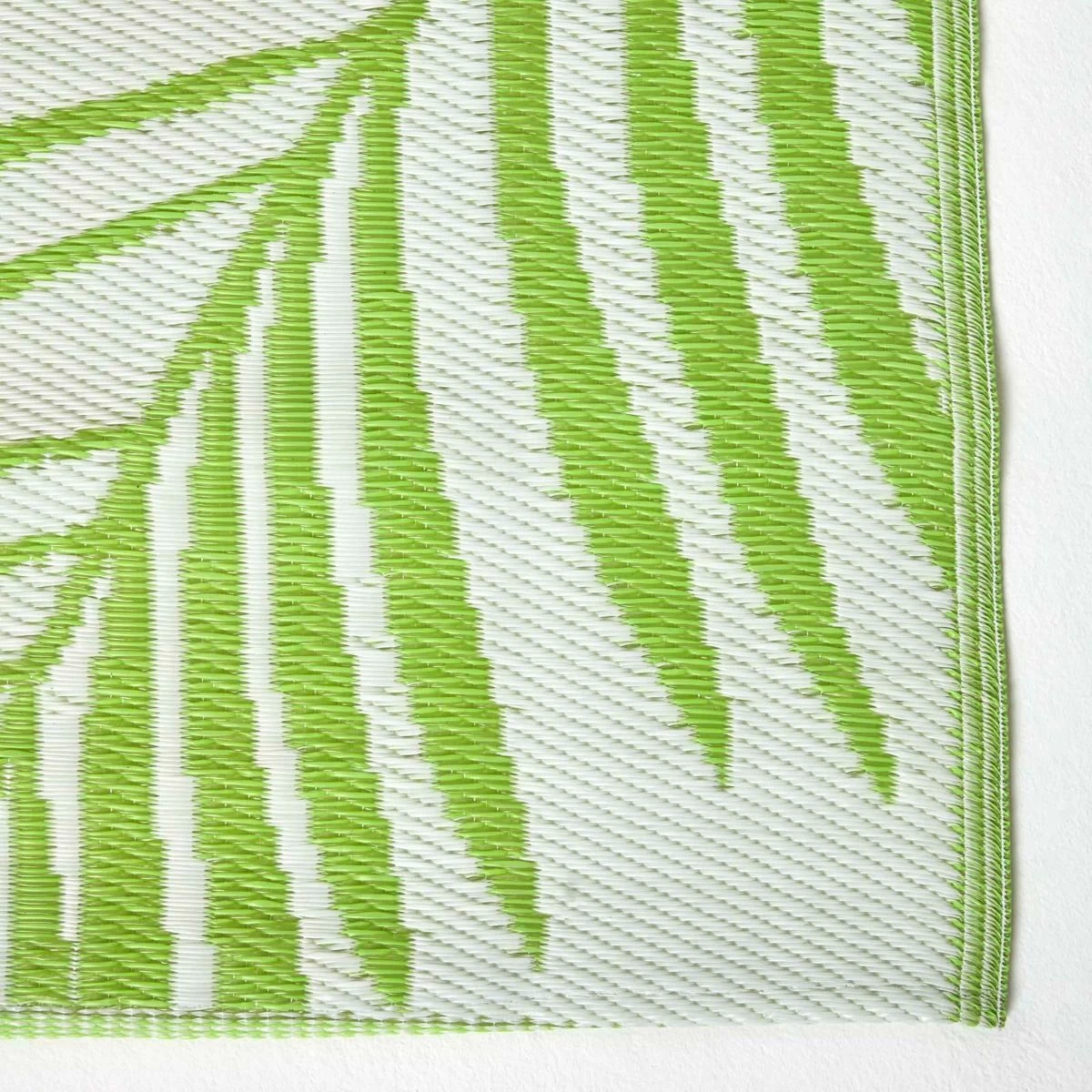 Adding life to your outdoor living areas, this tropical printed rug is designed to be placed in your garden. Made from 100% recycled polypropylene, it is suitable for outdoor use and is hardwearing. It features a contemporary tropical print of palm leaves in green and white and the design is also reversible.