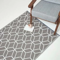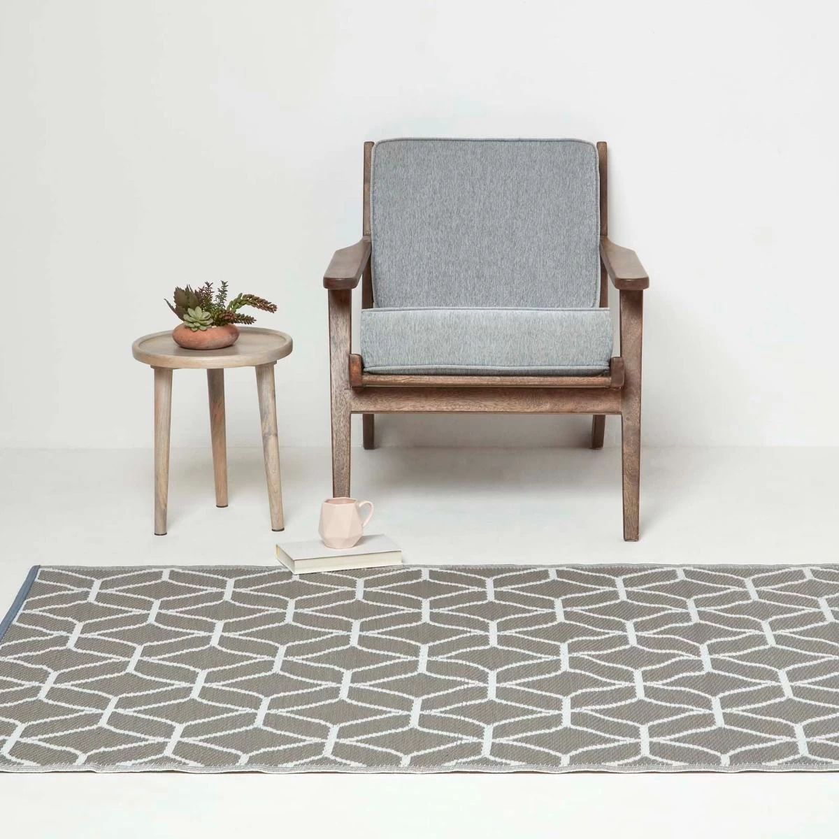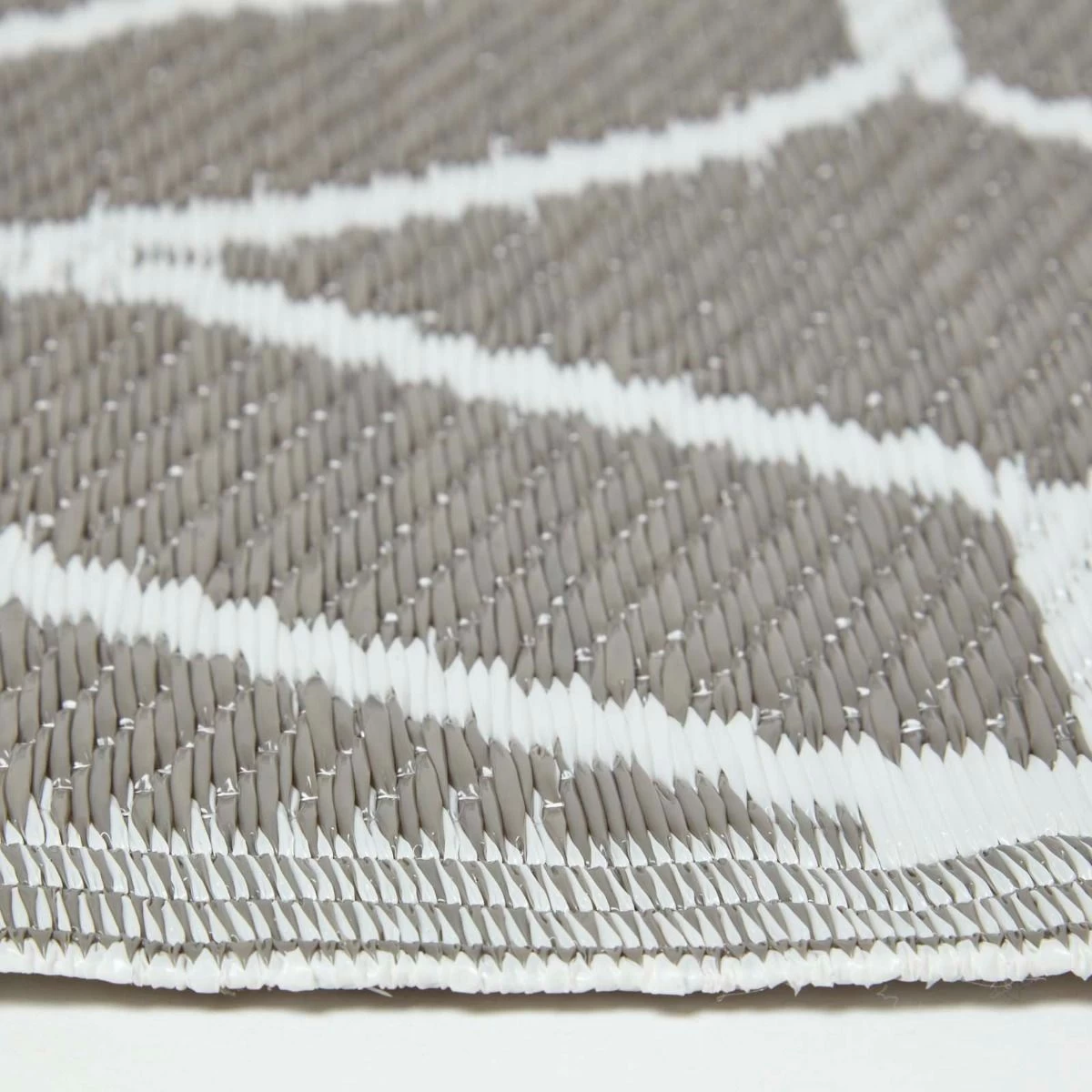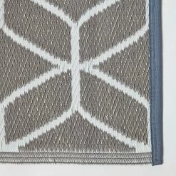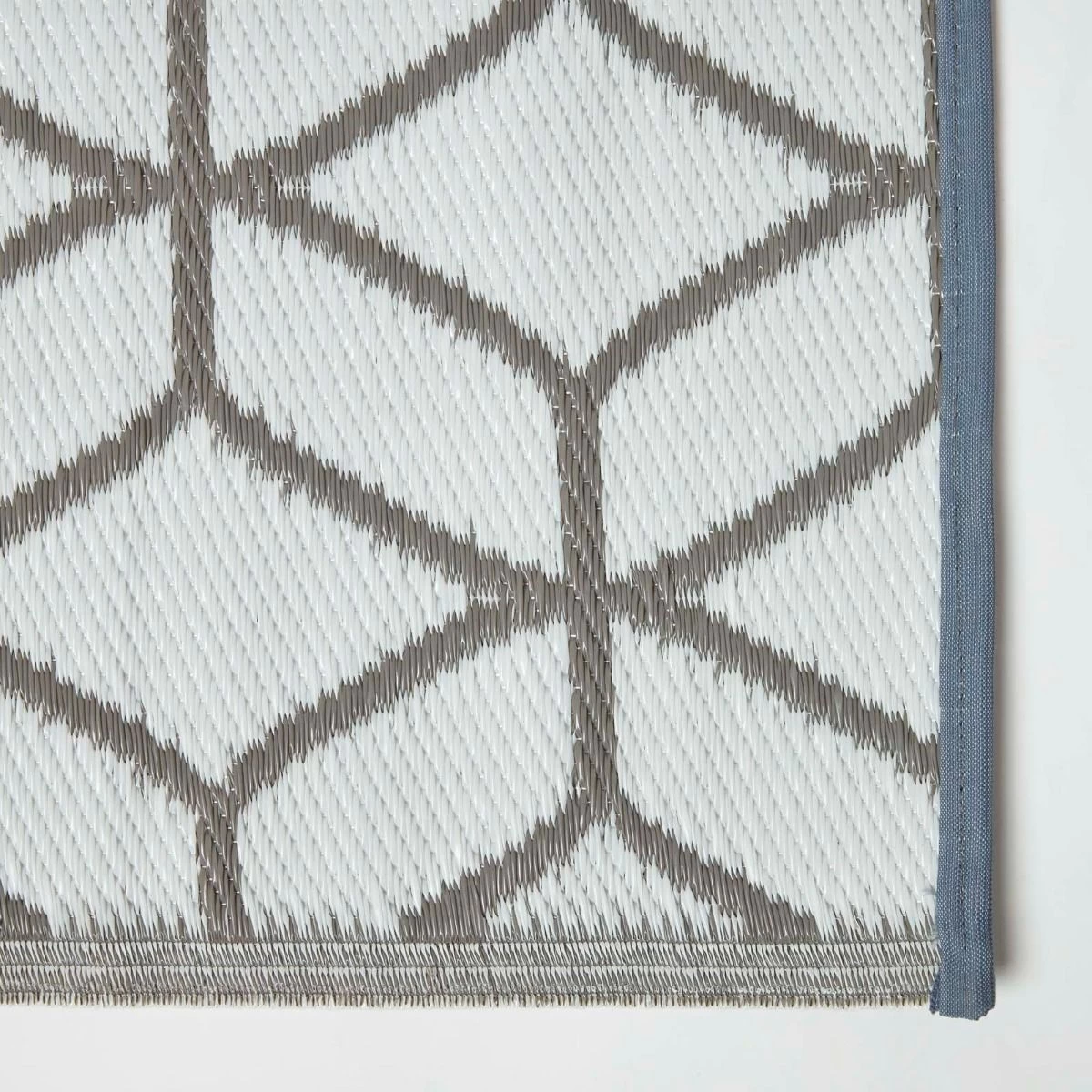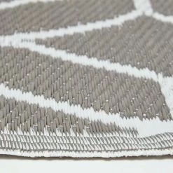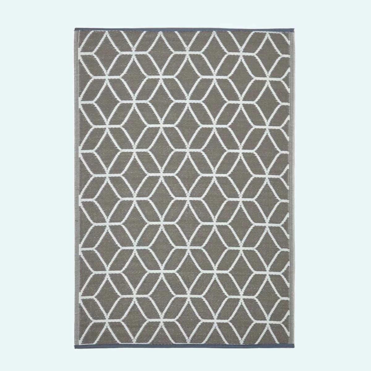 Geometric reversible garden rug designed for outdoor use measuring 120 x 180 cm. Features a geometric pattern in grey and white, can also be used indoors.