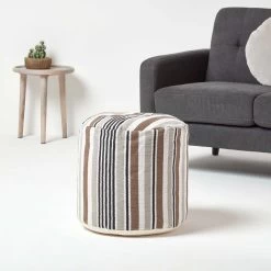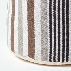 A circular footstool that will had colour and style to any room, Homescapes white, grey and black striped, bean filled footrest is prefilled with polystyrene balls.