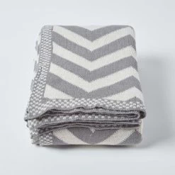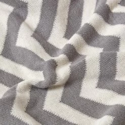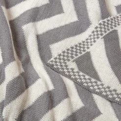Grey knitted throw geometric style cotton throw for sofa and beds with modern chevron pattern, thick and cosy throw available in large and extra-large sizes.