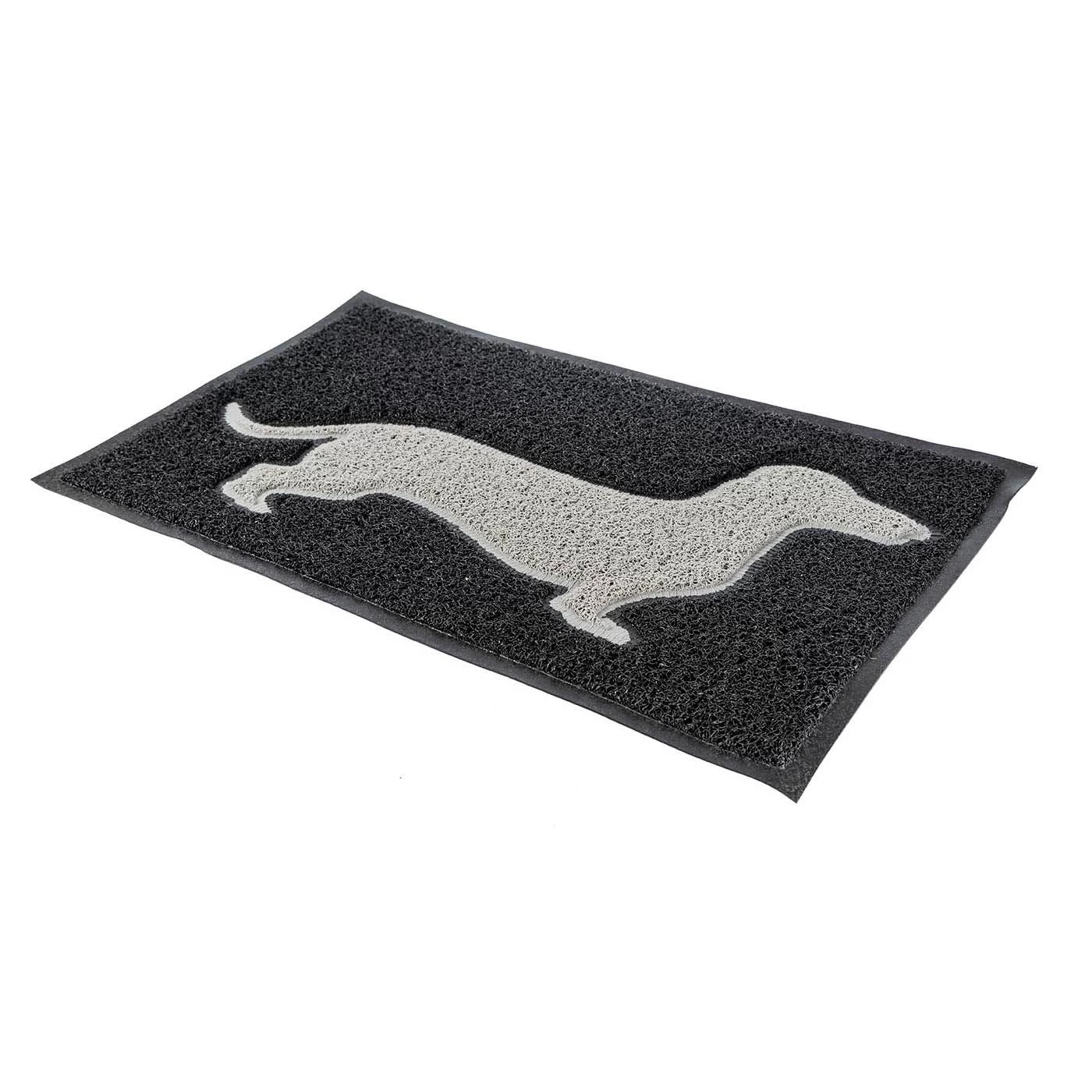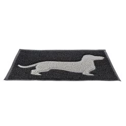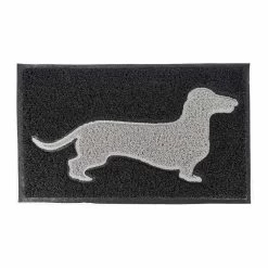 Featuring a black Dachshund dog, this grey and black door mat can be used indoors or outdoors. A perfect gift for dog lovers, this mat has 100% rubber backing for non-slip security.