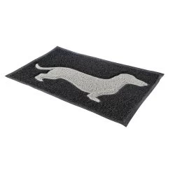 An adorable addition to any home, this PVC dog door mat can be used indoors or outdoors. On a grey background, this mat has a black Dachshund dog silhouette, and it makes the perfect gift for animal lovers or dog owners. The looped PVC design cleans dirt and grime off shoes and can be easily cleaned by wiping with a damp cloth.