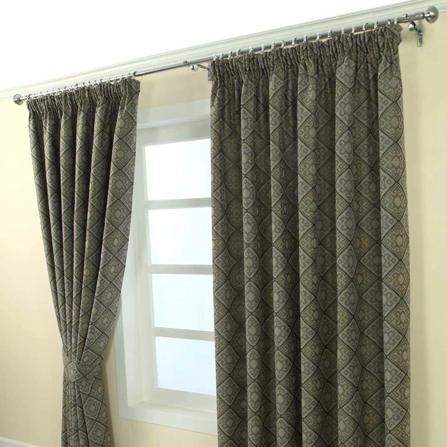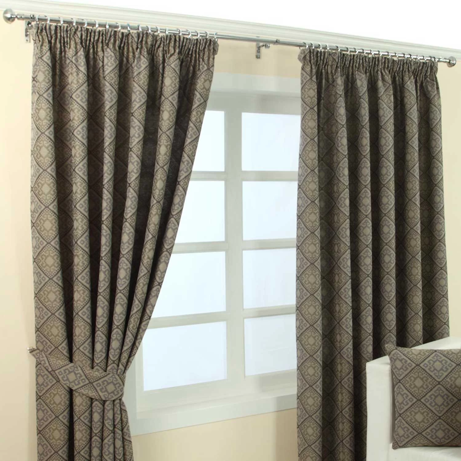 These pebble-coloured curtains are fully lined and pencil pleated for a classic look. Elaborate, Aztec-inspired details bring pattern to this traditional curtain pair.