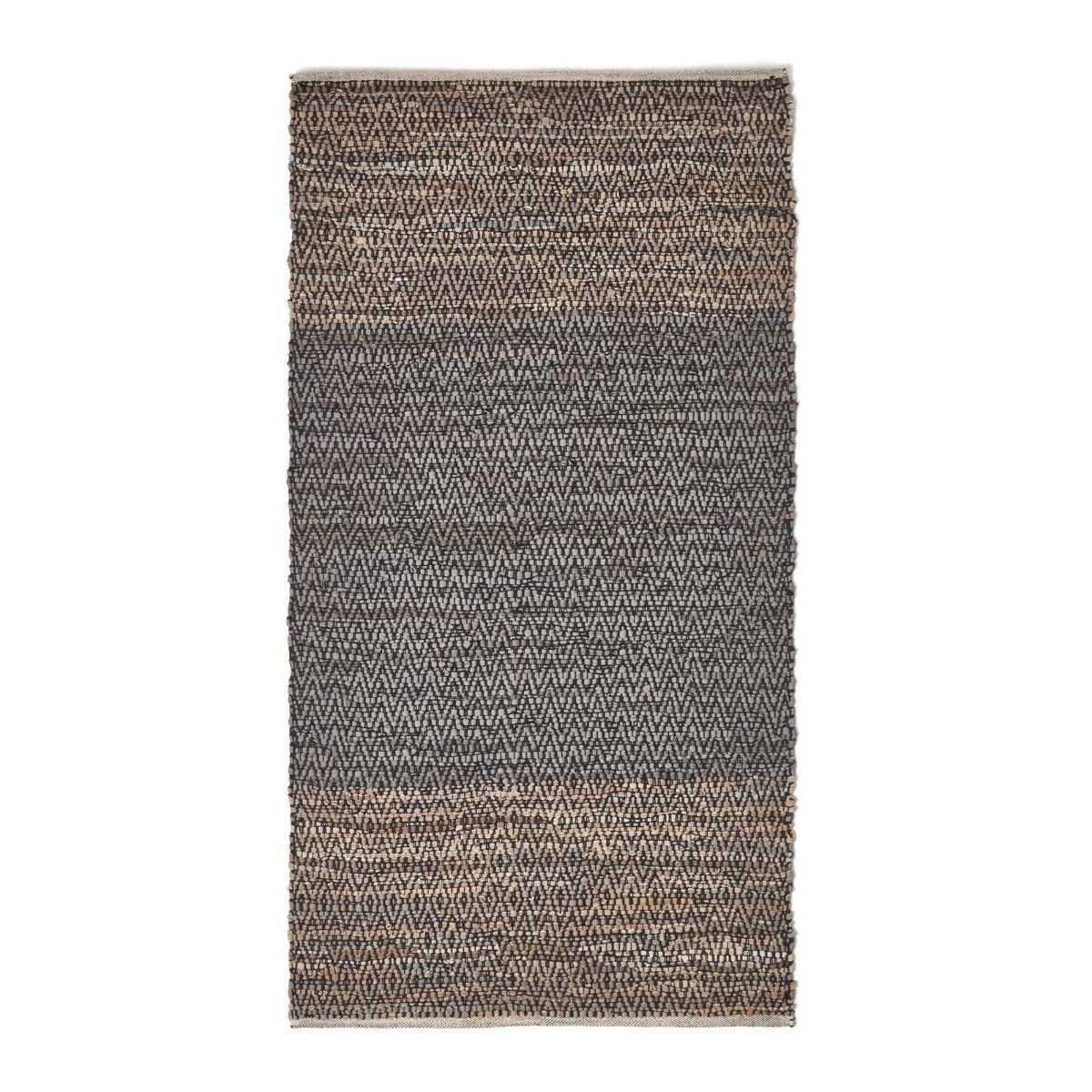 Herringbone pattern geometric style rug woven from recycled leather. Each piece of recycled leather is expertly woven to create an abstract zig-zag, chevron pattern. Combining a blue-grey colour with softer beige and cream tones, this environmentally friendly rug will introduce a natural bohemian style into any room.