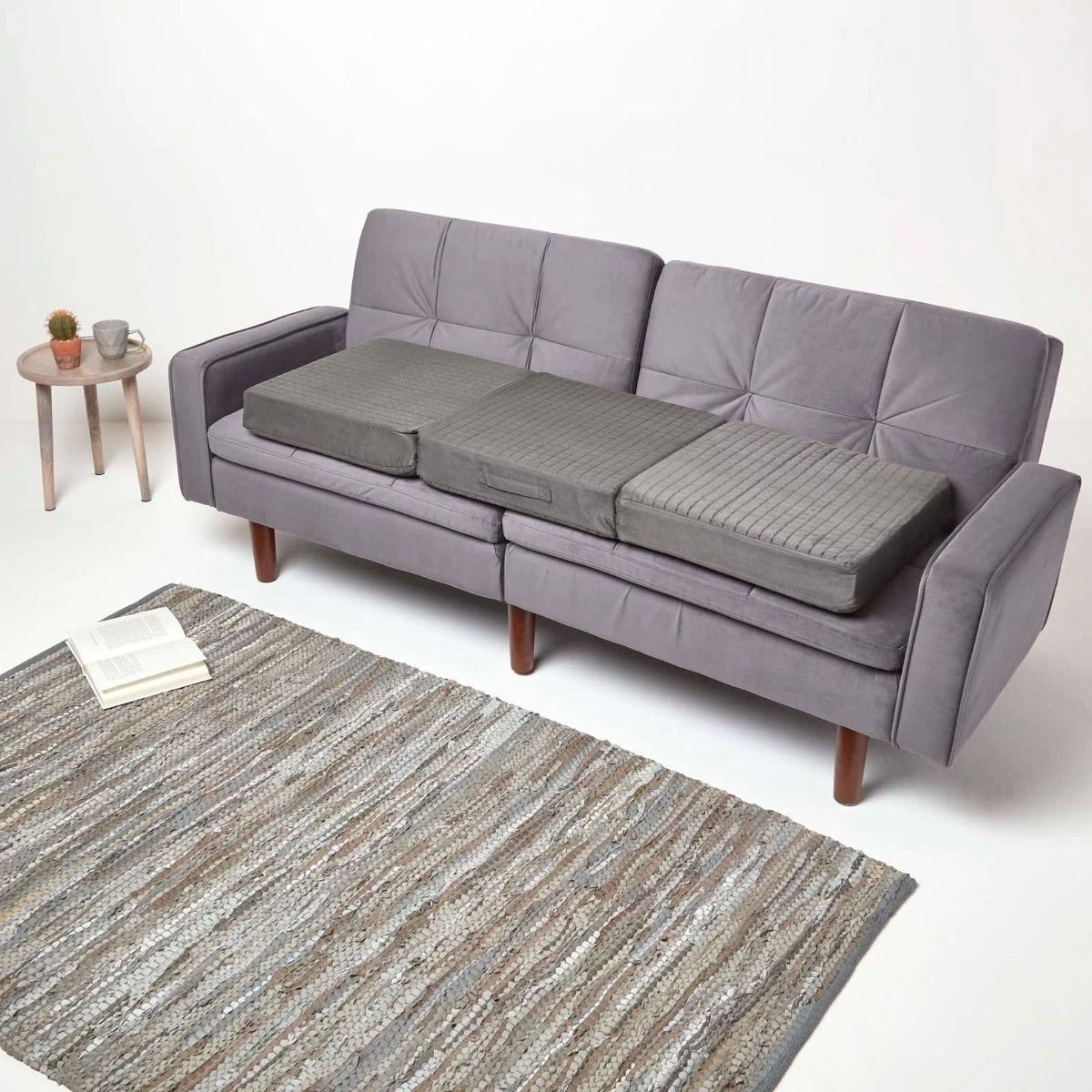 A durable booster cushion designed for everyday use, the firm foam filling is encased within a dark grey faux suede cover that can be easily removed. This soft casing features a square pattern quilting which has been lined with thick and durable polyester for added comfort. Easy to use by all ages, the cover features a compartment for each of the 3 square foam cushions, accessible via a zip running down 2 adjacent sides. The cover can be easily removed and washed and the foam re-inserted, keeping your booster cushion clean and fresh. Easy to transport, each booster cushion has a handy carry handle, the cushion can also be folded away when not in use. Part of Homescapes removable cover booster cushion collection, this booster cushion collection includes 2 seater and armchair size support cushions.