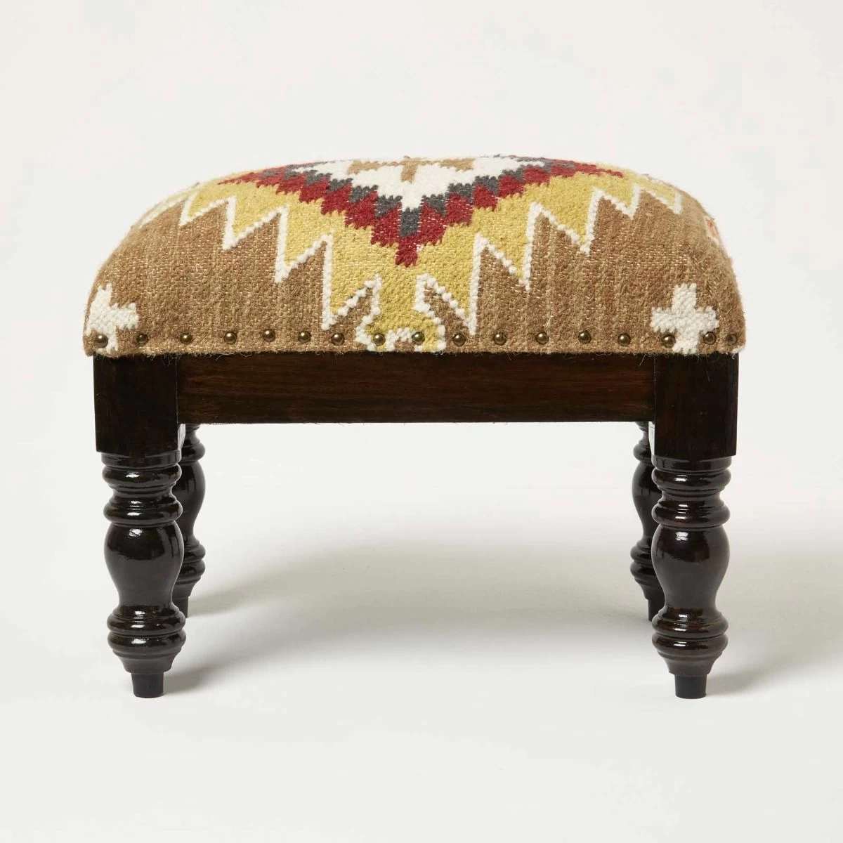 Handcrafted traditional style upholstered footstool. Featuring a timeless geometric style pattern, this kilim footstool features a striking brown, orange and red geometric design that will complement both modern and traditional interior styles. Handwoven from durable wool and cotton on a traditional style loom, each footstool is truly unique and has been expertly upholstered and generously filled with durable poly fibre. Sitting on a solid wooden base and legs that have been stained and lacquered, it is sure to be loved for years to come.