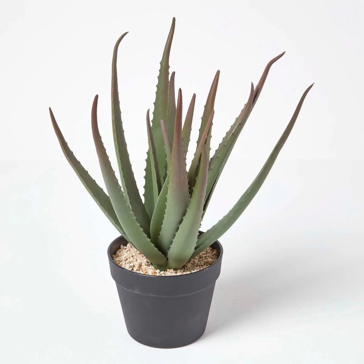 Create a natural look in your home with this tall artificial Aloe Vera plant from Homescapes. Measuring approximately 45 cm tall, set inside a black pot.