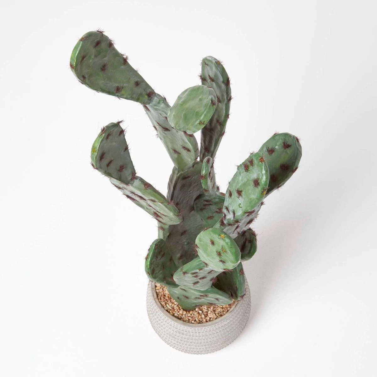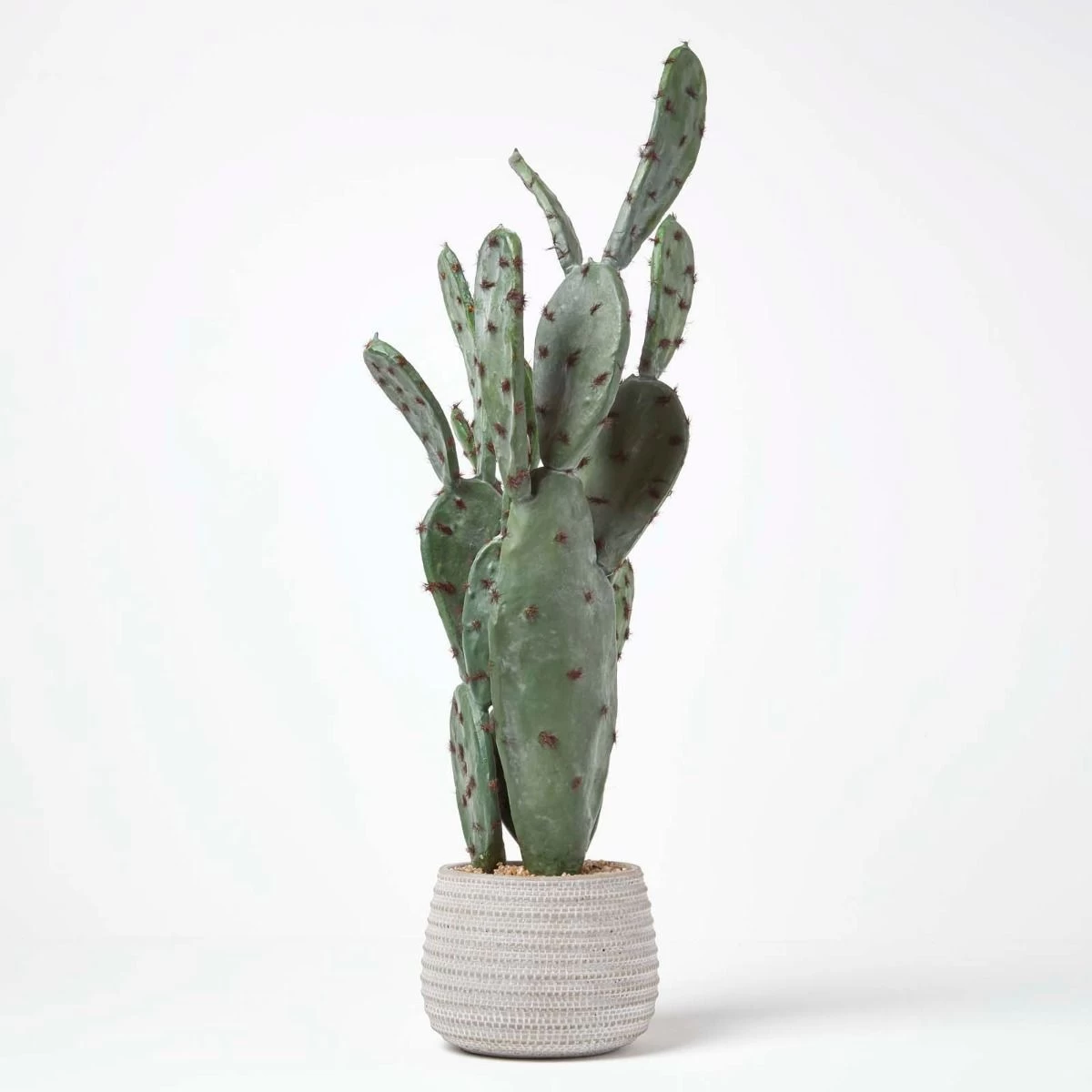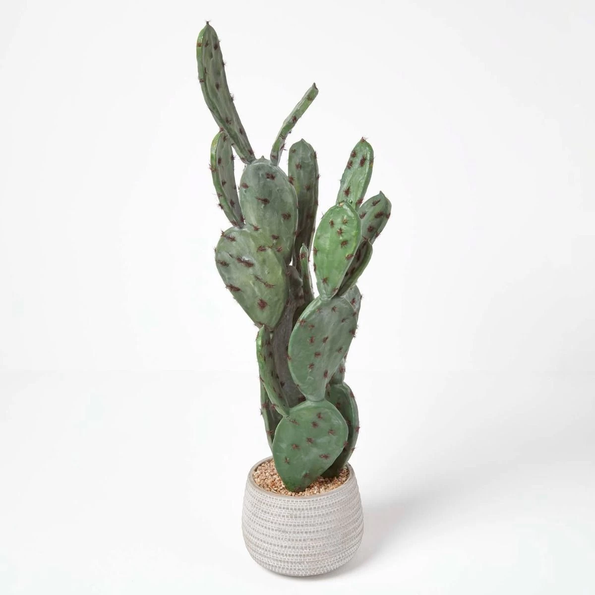 Artificial Bunny Ear cactus plant from Homescapes, set inside a decorative cement pot. Measures approximately 50 cm tall.