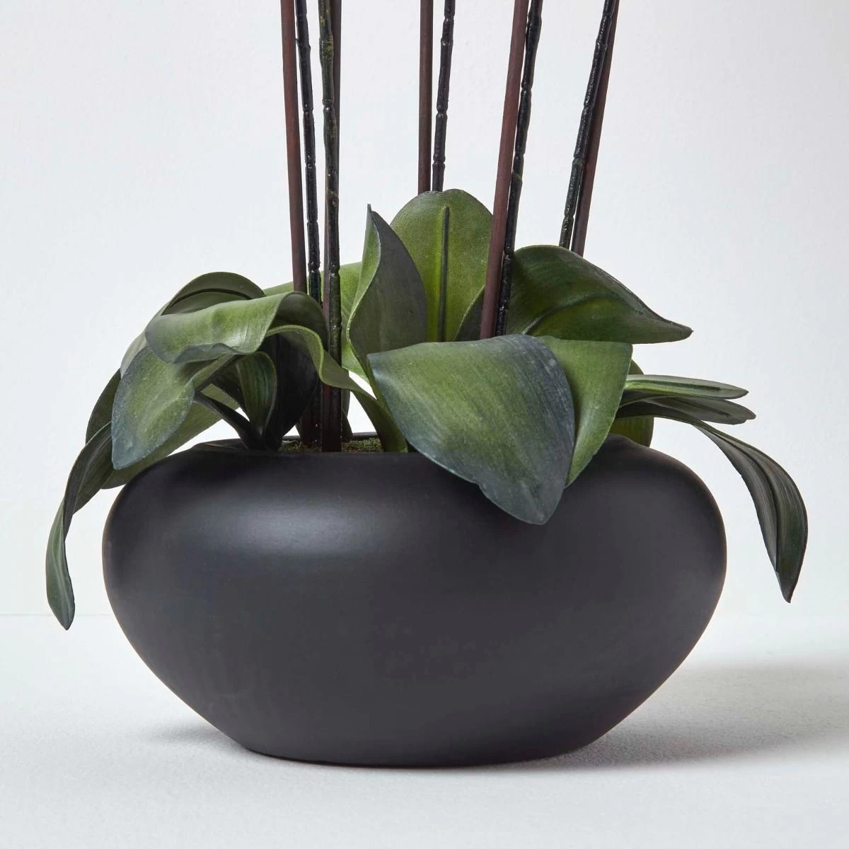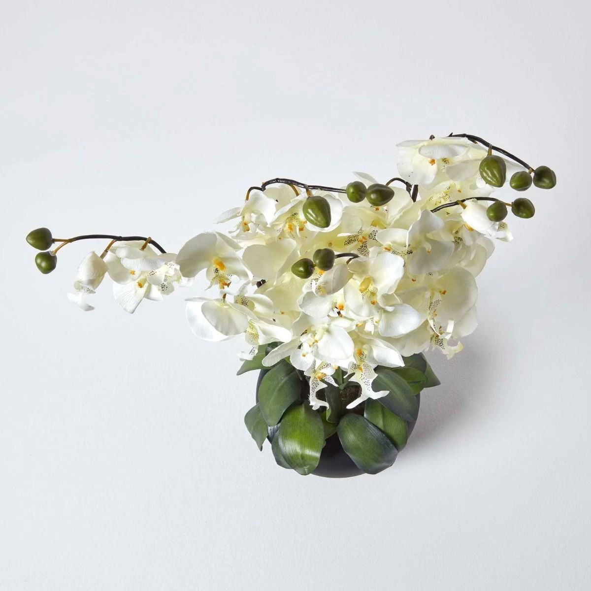 The elegant large oriental style Cream Orchids with silk flowers in black bowl would make a lovely feature of any room be it home or a workplace. The vibrant silk flower with life like leaves makes these replica plants as good as any real plant. Orchids are timeless and this arrangement comes as an excellent alternative to growing and maintaining real plants. What a beautiful way to bring life to your interiors!
