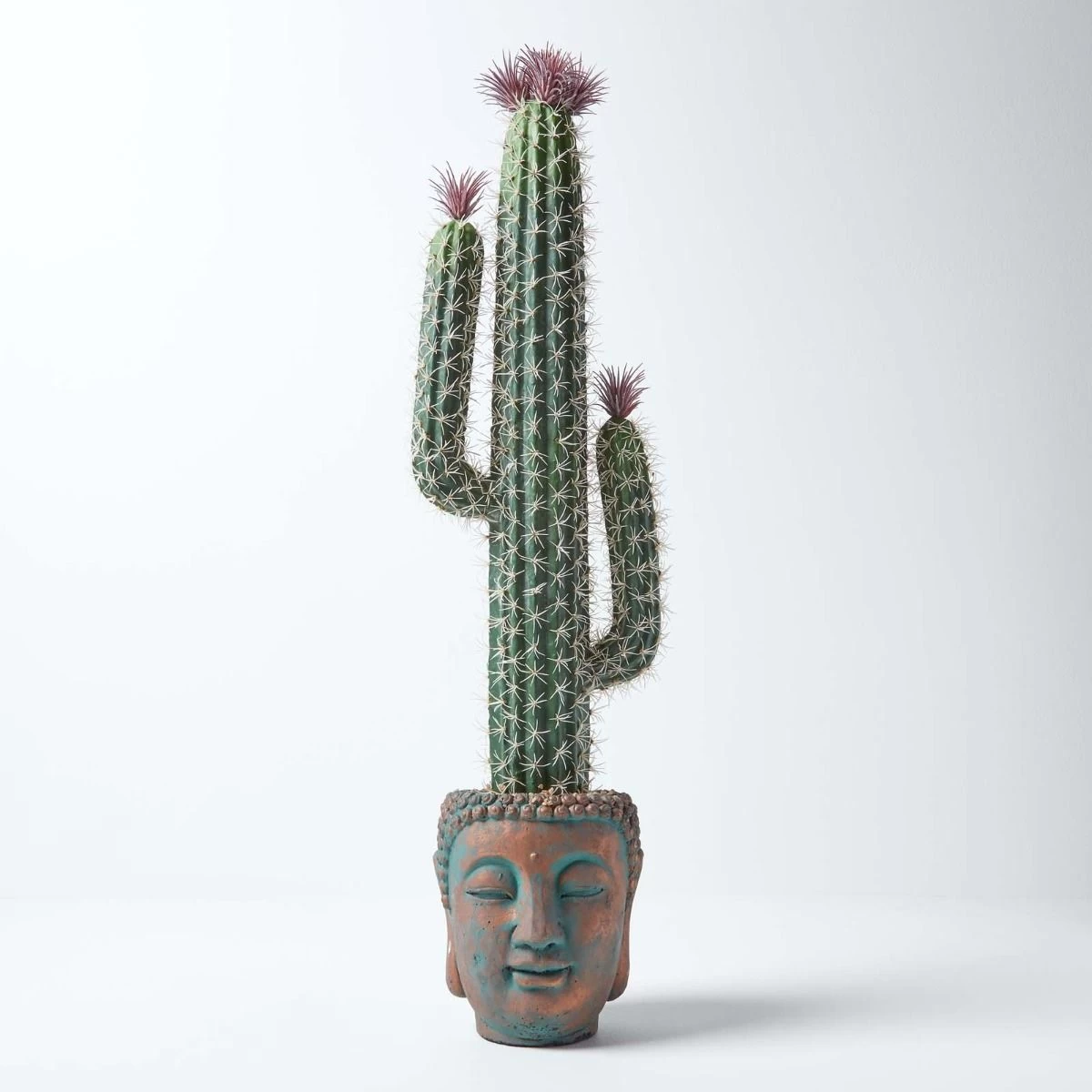 Artificial Saguaro cactus set inside a decorative Buddha head pot. Measuring approximately 78 cm tall, this large fake succulent is easy to maintain.