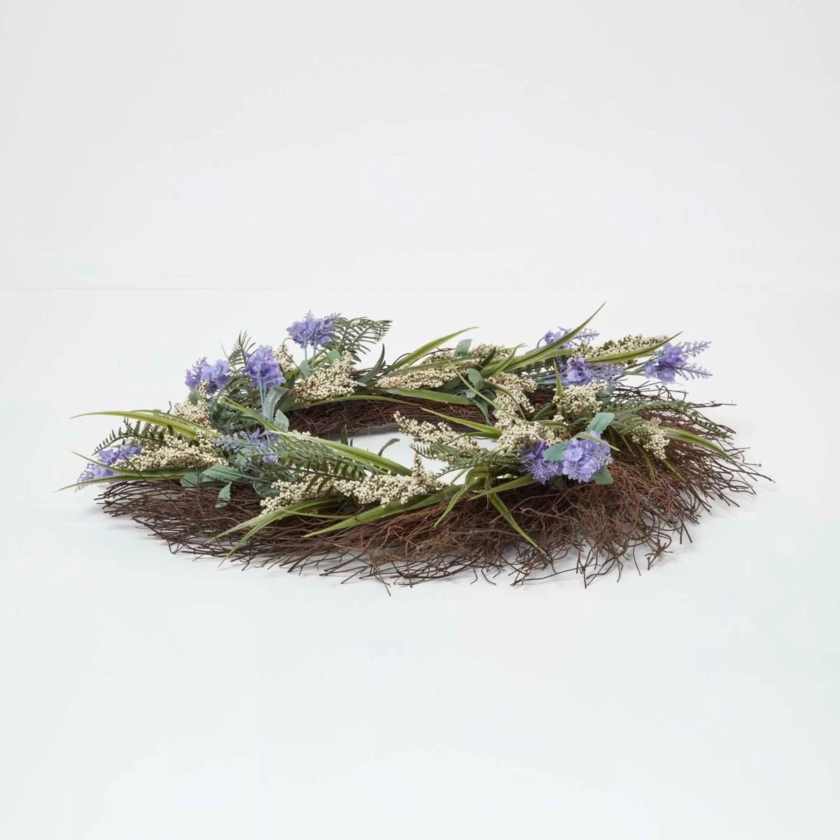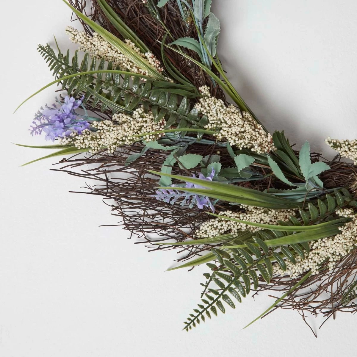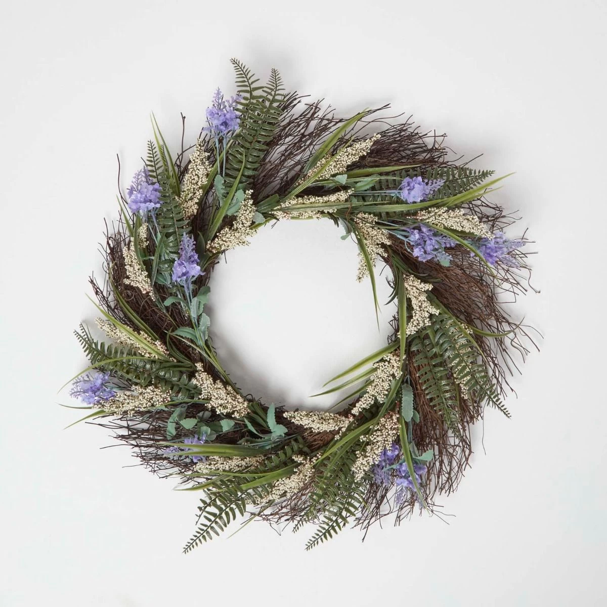 Brighten up your home with this lavender spring wreath. Woven from silk-like polyester and wicker, each flower has been hand-crafted for a botanically correct look that will fool all visitors. Simply wipe with a dry cloth as needed.