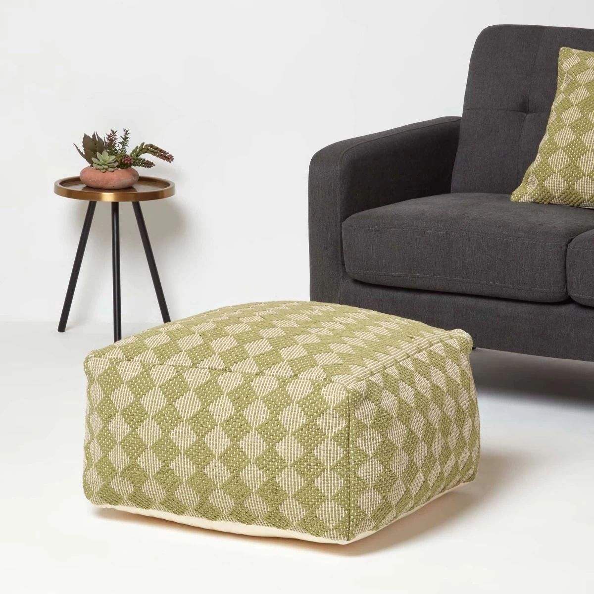A handwoven pouffe for living rooms, ideal for both decoration as well as daily use. Square in shape with a firm filling, this woven pouffe can be used to prop your feet up after a long day, as an occasional seat or even as a side table. Measuring 55 x 55 cm and 30cm tall, this on-trend ochre pouffe has a repeating woven diamond pattern and features a generous polystyrene bead filling.