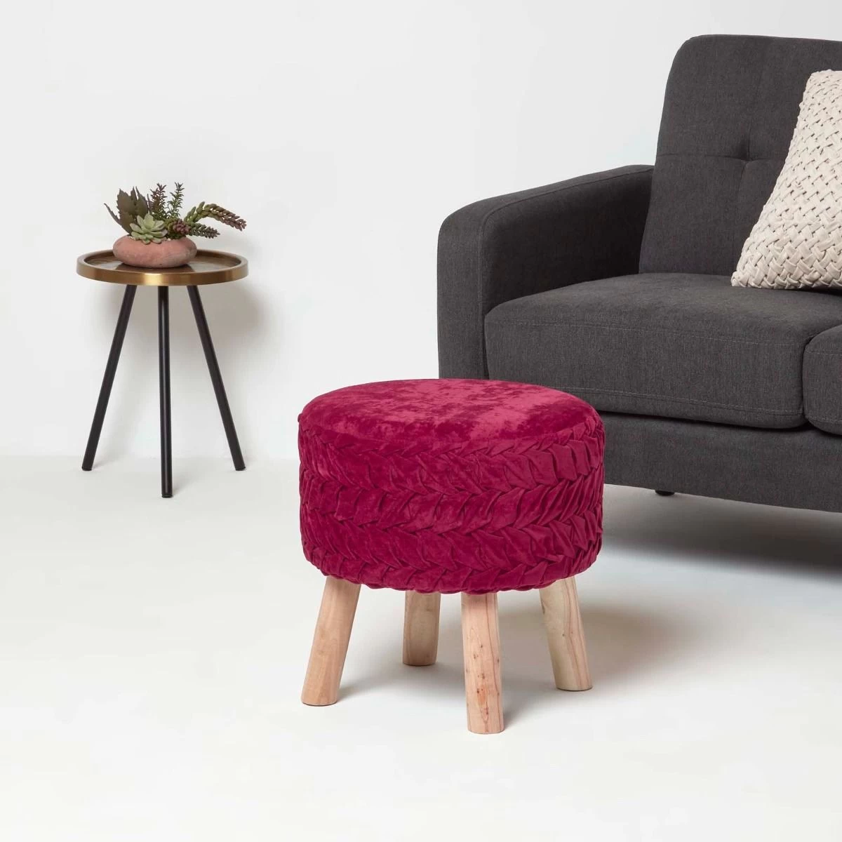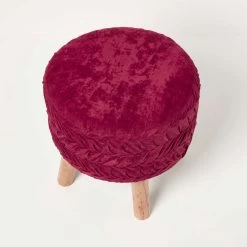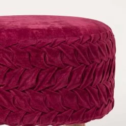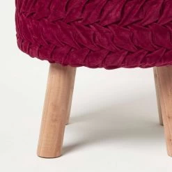 Dark pink velvet footstool, a colourful home accessory woven from a super soft 100% cotton velvet, sitting on sturdy wooden legs this vibrant pouffe is ideal for bedrooms and living rooms.