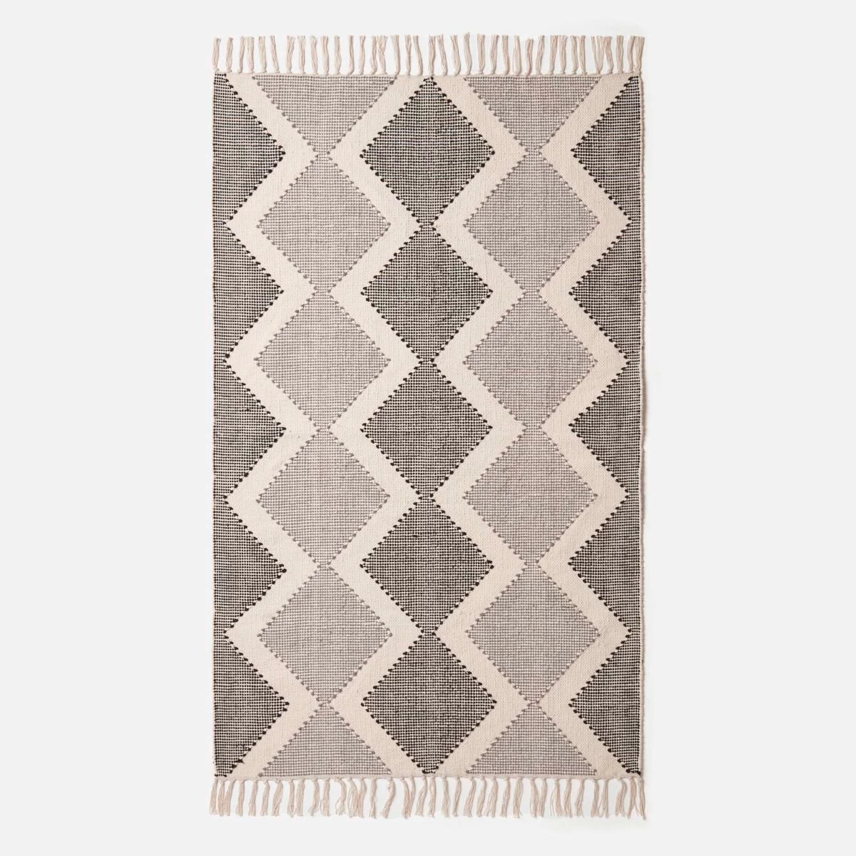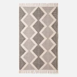 Malmo chevron woven rug in grey and white. Available in two sizes, this textured rug has been handwoven from luxury 100% cotton and features macrame tassels.