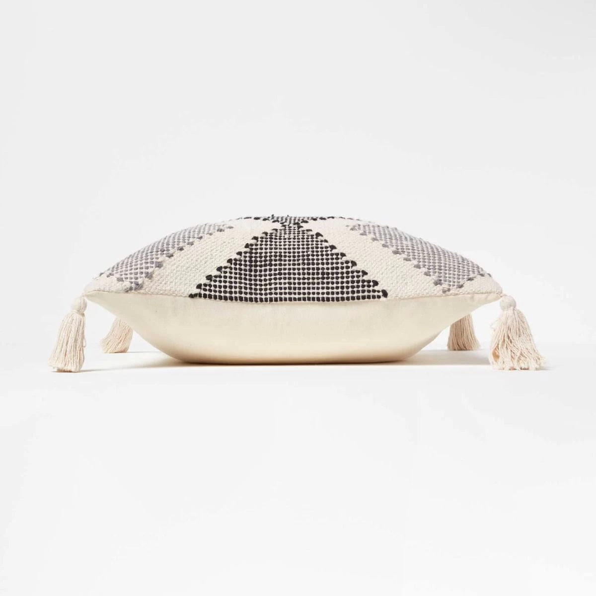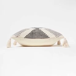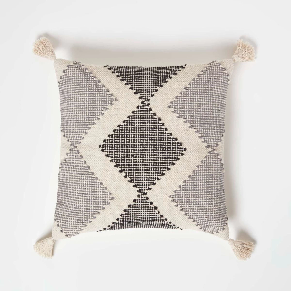A handwoven cushion for sofas, designed for both comfort and decor; generously filled with a super microfibre insert and encased in luxury 100% cotton in a trio of neutral colours. Featuring oversized woven diamonds in neutral hues and intricate macrame tassels, this premium cushion is the ideal statement piece for your home. Measuring 45 x 45 cm, the Malmo scatter cushion can be used in any room to refresh the space and add comfort to your seating area.
