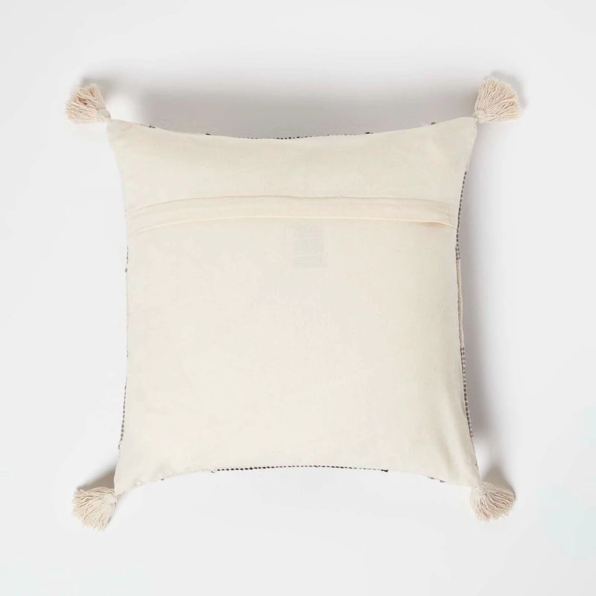Malmo woven cushion with large tassels and chevron pattern. A tassel cushion that features a textured front and a plain cream reverse, with a zip at the back.