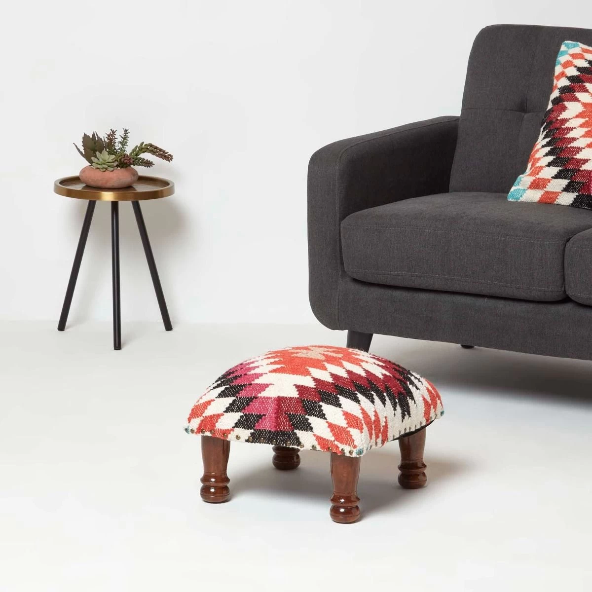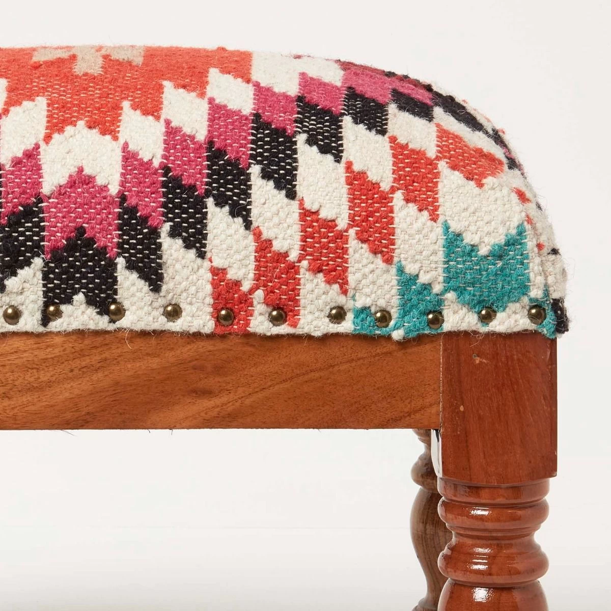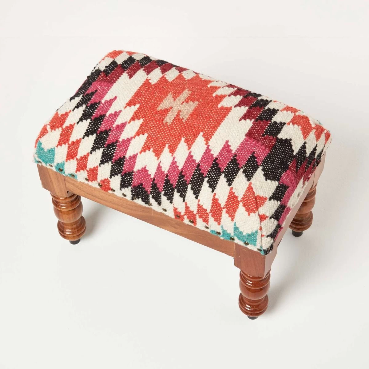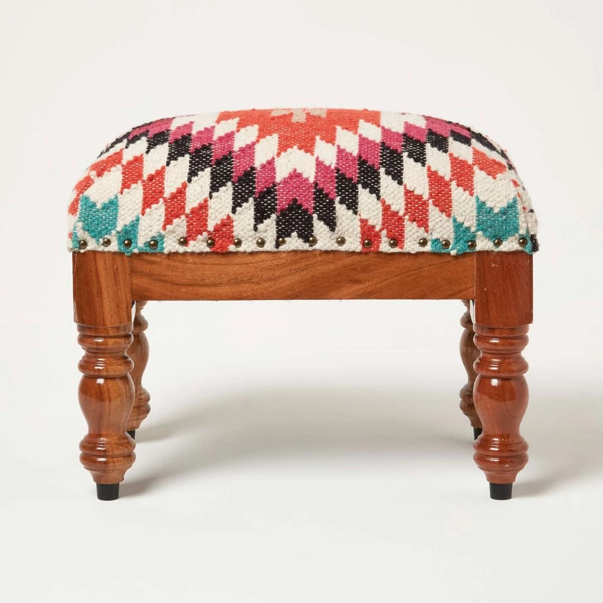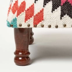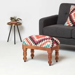 Handcrafted traditional style upholstered footstool. Featuring a timeless geometric style pattern, this kilim footstool features a striking orange, pink and blue geometric design that will complement both modern and traditional interior styles. Handwoven from durable wool and cotton on a traditional style loom, each footstool is truly unique and has been expertly upholstered and generously filled with durable poly fibre. Sitting on a solid wooden base and legs that have been stained and lacquered, it is sure to be loved for years to come.
