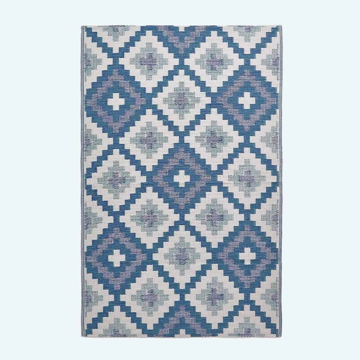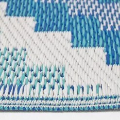 Blue outdoor rug woven from 100% recycled plastic this colourful garden rug features a blue Aztec style geometric pattern is light weight and weather resistant.