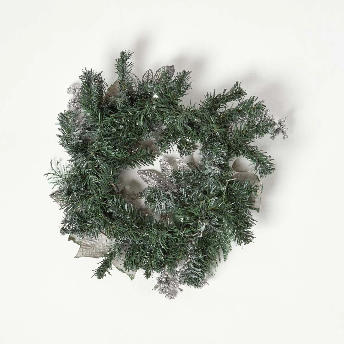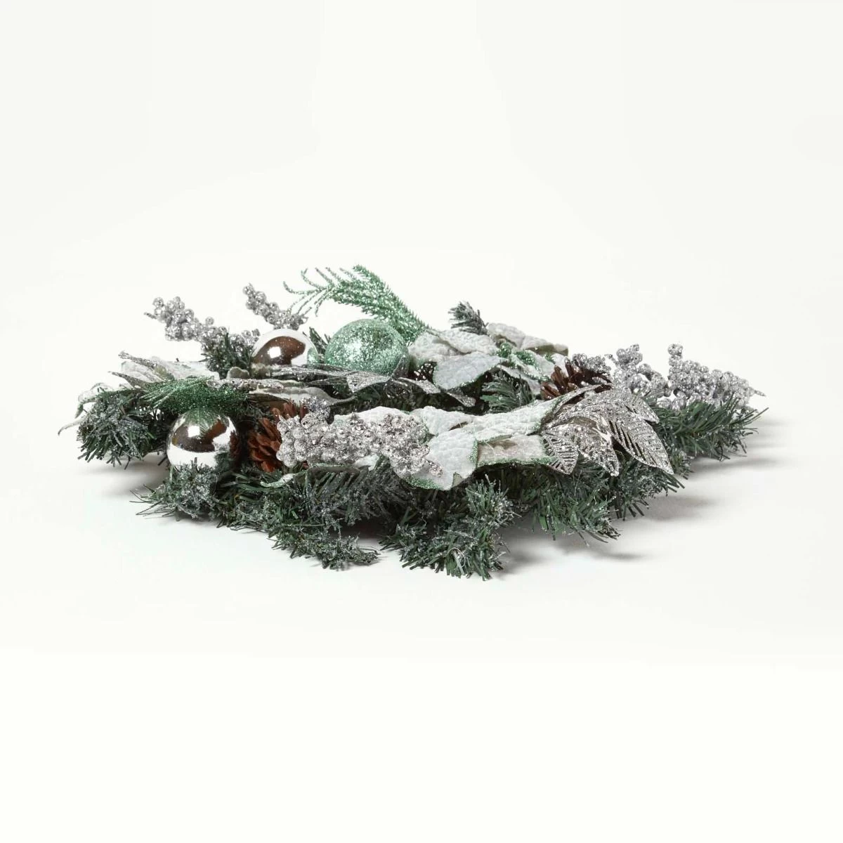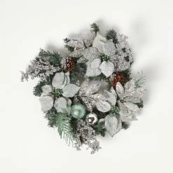 Decorative pale green and silver round Christmas wreath, Measuring 45 cm wide, this traditional style wreath includes an array of real pinecones, decorative poinsettia leaves and shiny baubles. The Mint green collection includes a co-ordinating garland for you to complete the look.