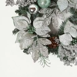 Mint green and silver Christmas wreath, round door wreath with poinsettia, baubles and pinecones on a solid frame, for indoor and front door decoration.
