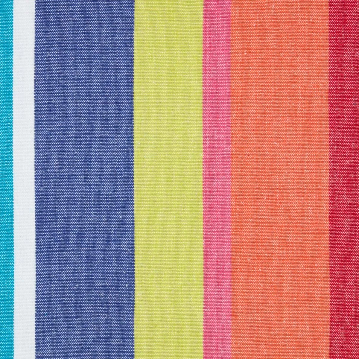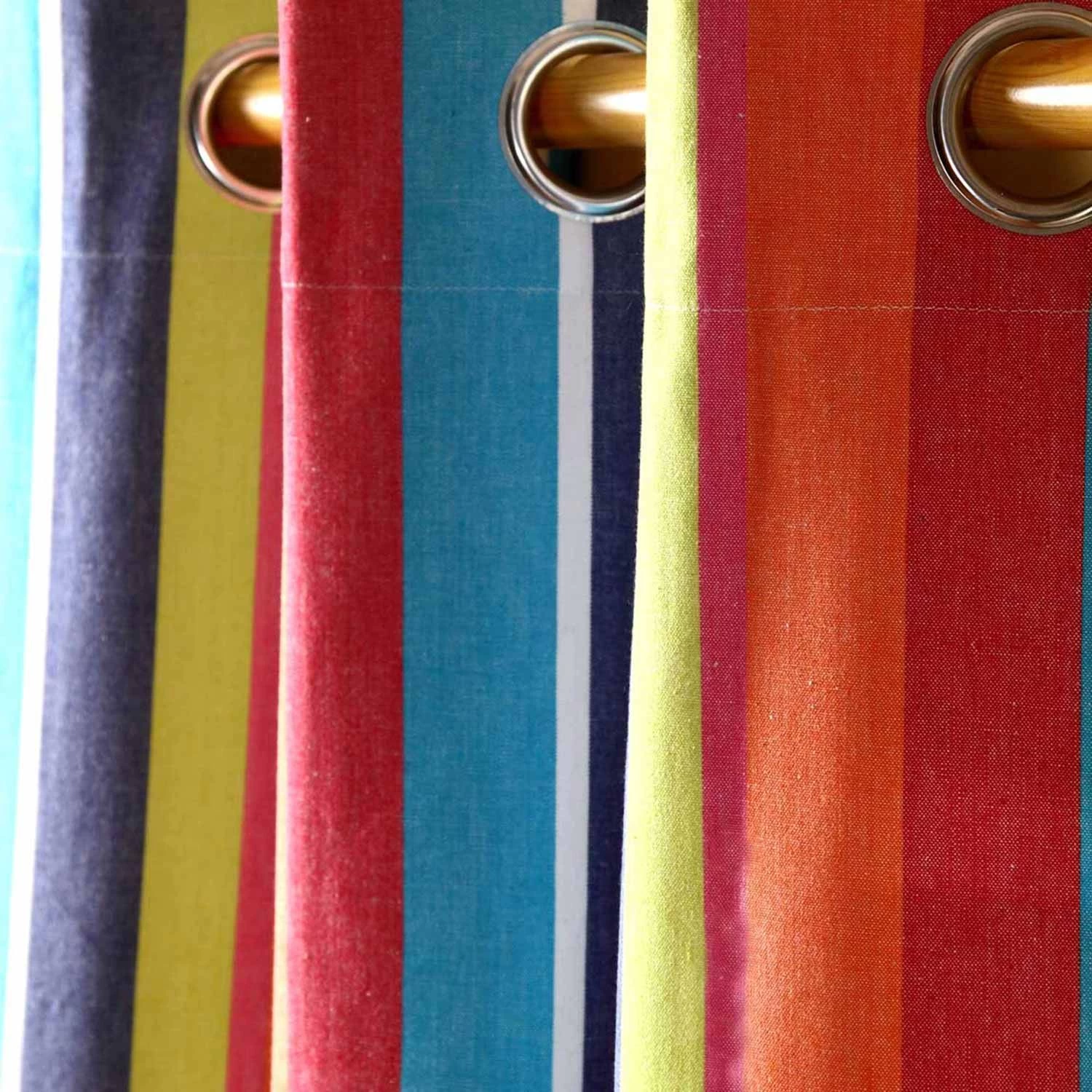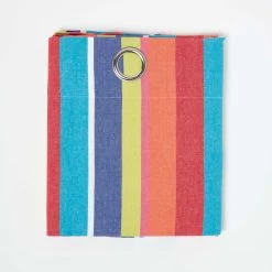 These chic Multi Stripe Eyelet Curtains are the ideal interior accessory for you if you want to add a stylish flair to any room. The striking colours all perfectly complement each other, and these sophisticated curtains are ideal for any room with a modern decor. These contemporary Multi Stripes Curtains are one pair in Homescapes impressive range of pure cotton designer curtains in many charming designs and soft prints. Our modern ring top or eyelet curtains are made with heavy cotton fabric and a wide range of colours, which allows our curtains to coordinate well with almost any interior setting and the vivid colours used are able to uplift the mood of any room. These curtains are suitable for all spaces, and would fit perfectly in the kids rooms due to their refreshing print. Please note, these curtains are not lined and so they will have to be used in conjunction with a black out curtains in order to make them light proof. Coordinating fabric (to make your own soft furnishings), cushions and floor cushions are also available with Homescapes.