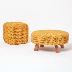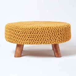 Measuring 62cm round, this mustard 100% cotton knitted footstool includes wooden legs for that extra modern look, an ideal accessory for your living room.