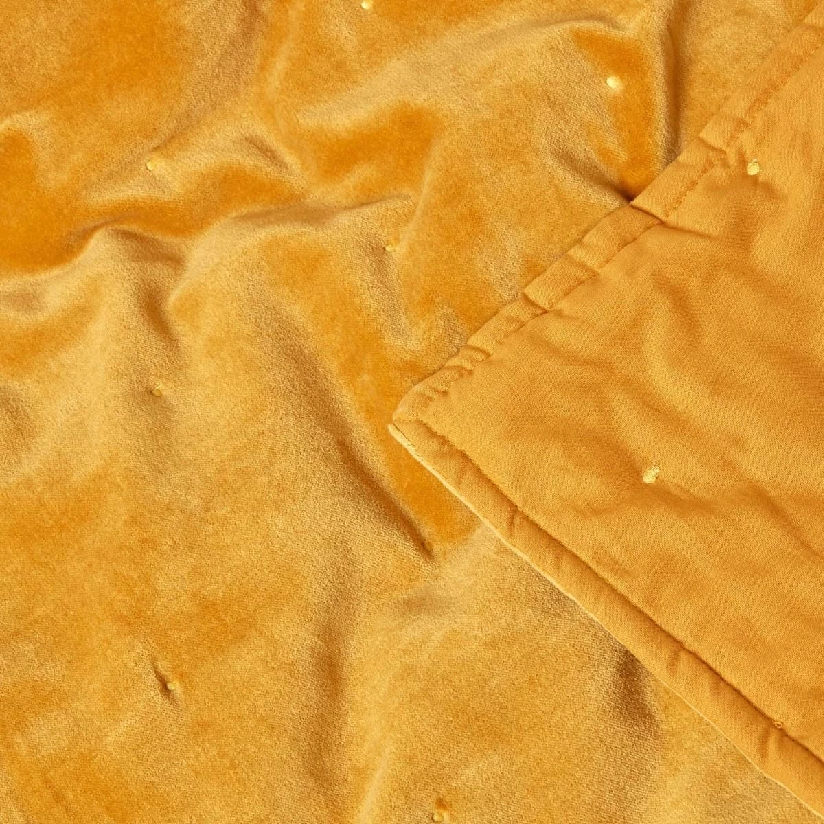 Mustard throw woven from 100% cotton velvet and handstitched with embroidery. For warmth, this quilted throw is filled with polyester fibre, available in 2 sizes.