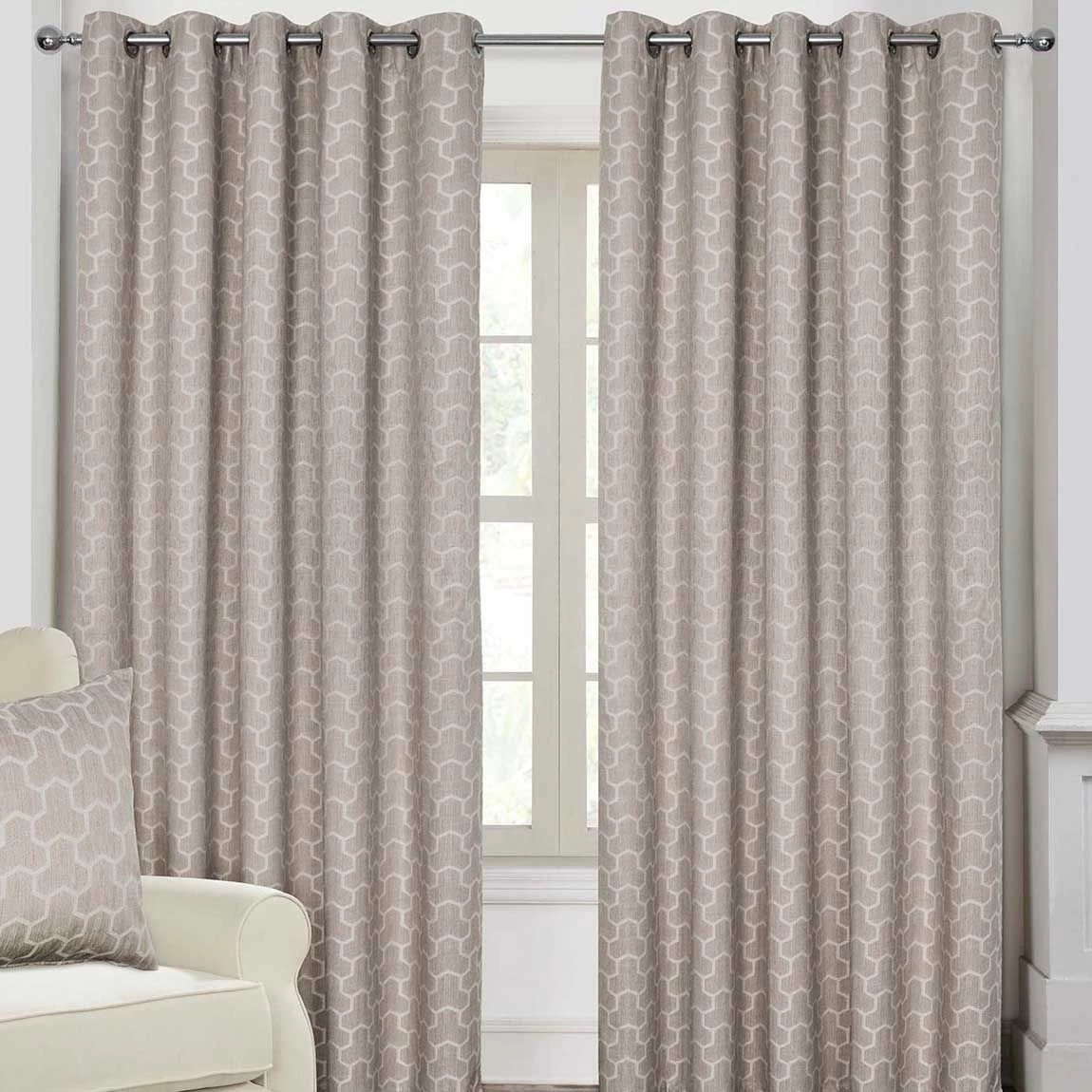 Geometric style curtain pair from Homescapes in a natural shade. Eyelet style for easy use, these readymade curtains have complete 3 pass blackout lining.