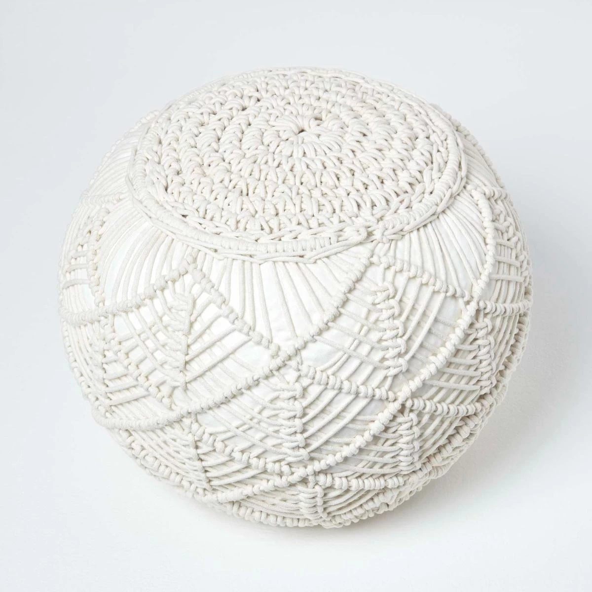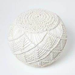 Natural crochet knitted pouffe with on-trend macramé style pattern, woven from 100% cotton this versatile round footstool is generously filled for lasting comfort.